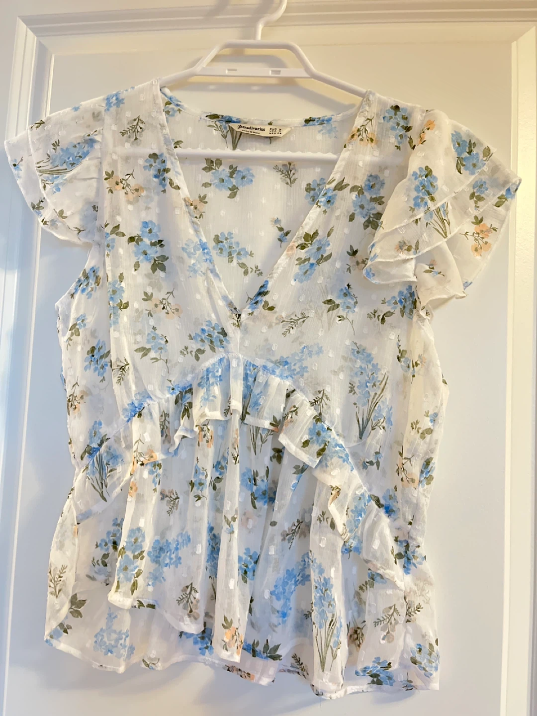 Cute Stradivarius blouse with a floral pattern and ruffle detailing! It's a size EUR S and in great condition. Perfect for adding a touch of spring to your wardrobe!