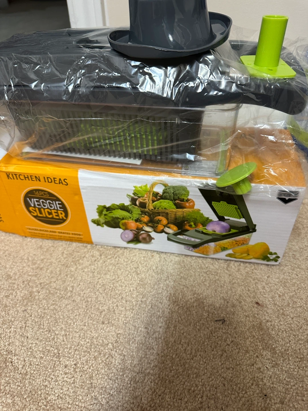 This Kitchen Ideas veggie slicer comes with 16 pieces for all your chopping needs. It's made of plastic and includes various blades for slicing and grating. This tool is handy for prepping vegetables quickly.