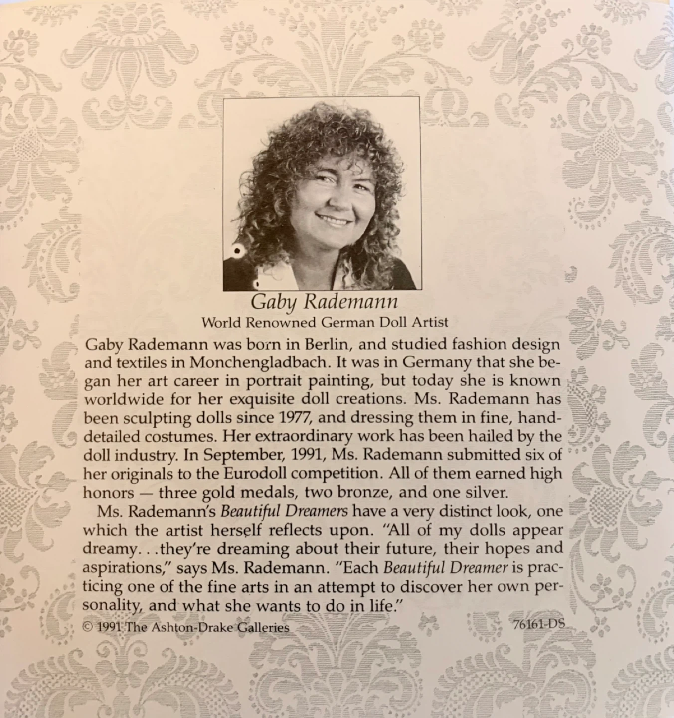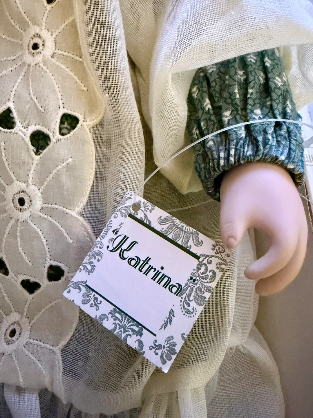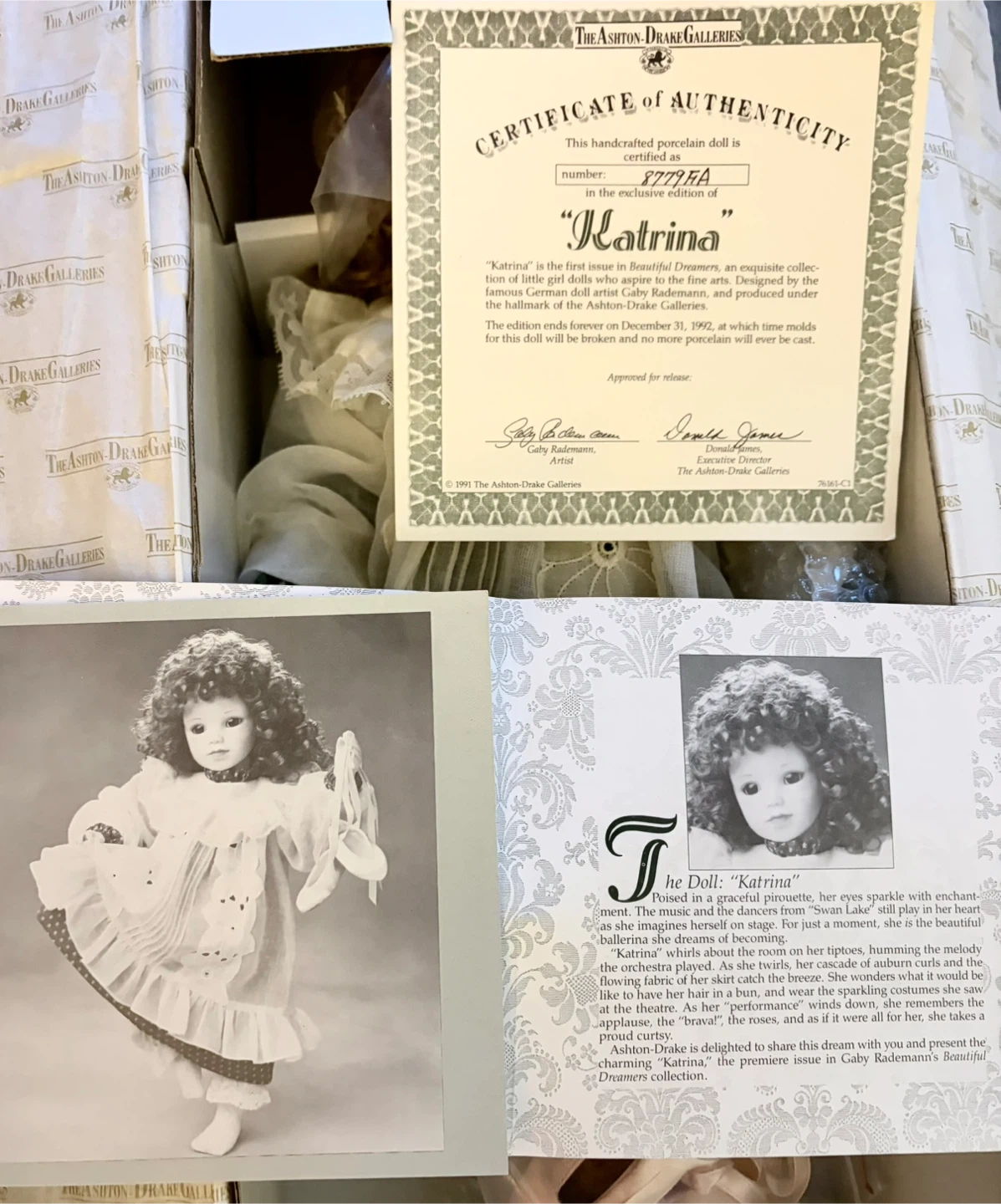 Limited edition #8779 of vintage porcelain doll “Katrina” circa 1991 by The Ashton-Drake Galleries. Was the premiere issue of world renowned German doll artist, Gaby Rademann’s Beautiful Dreamers Collection.