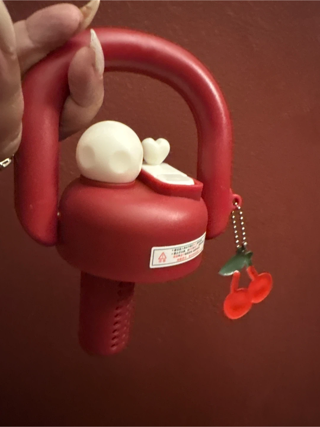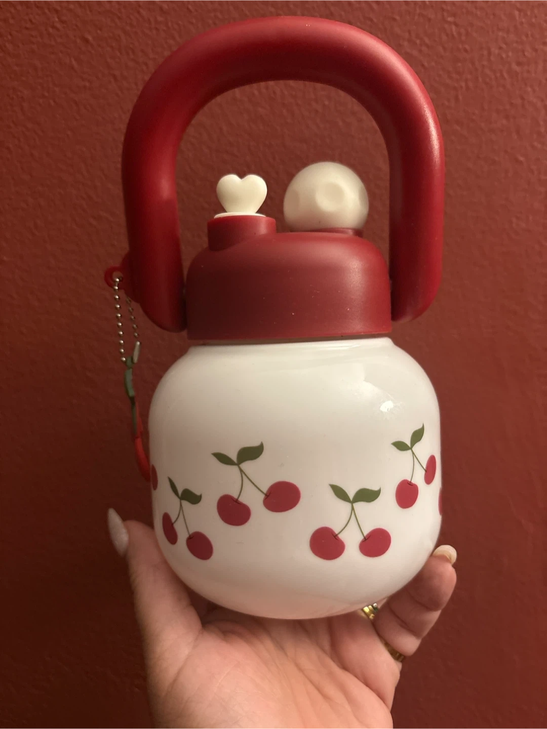 This charming water bottle features a playful cherry design. It has a secure flip-top lid and a convenient carrying handle. Perfect for staying hydrated on the go! New