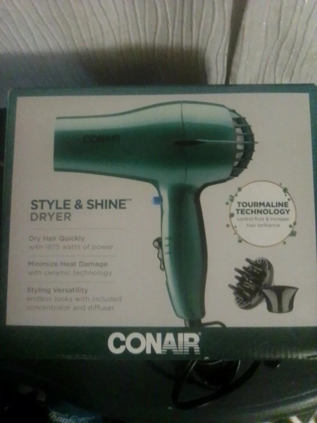 This Conair Style & Shine hair dryer quickly dries hair with 1875 watts of power. It minimizes heat damage with ceramic technology. Includes a concentrator and diffuser for styling versatility.
