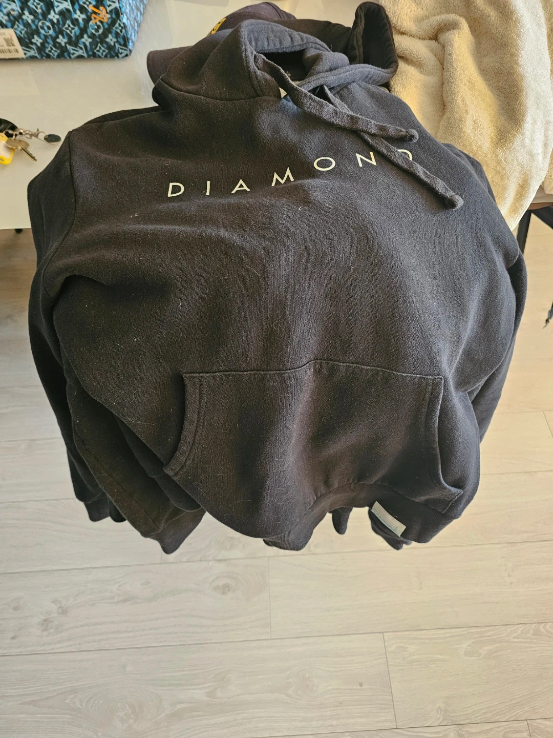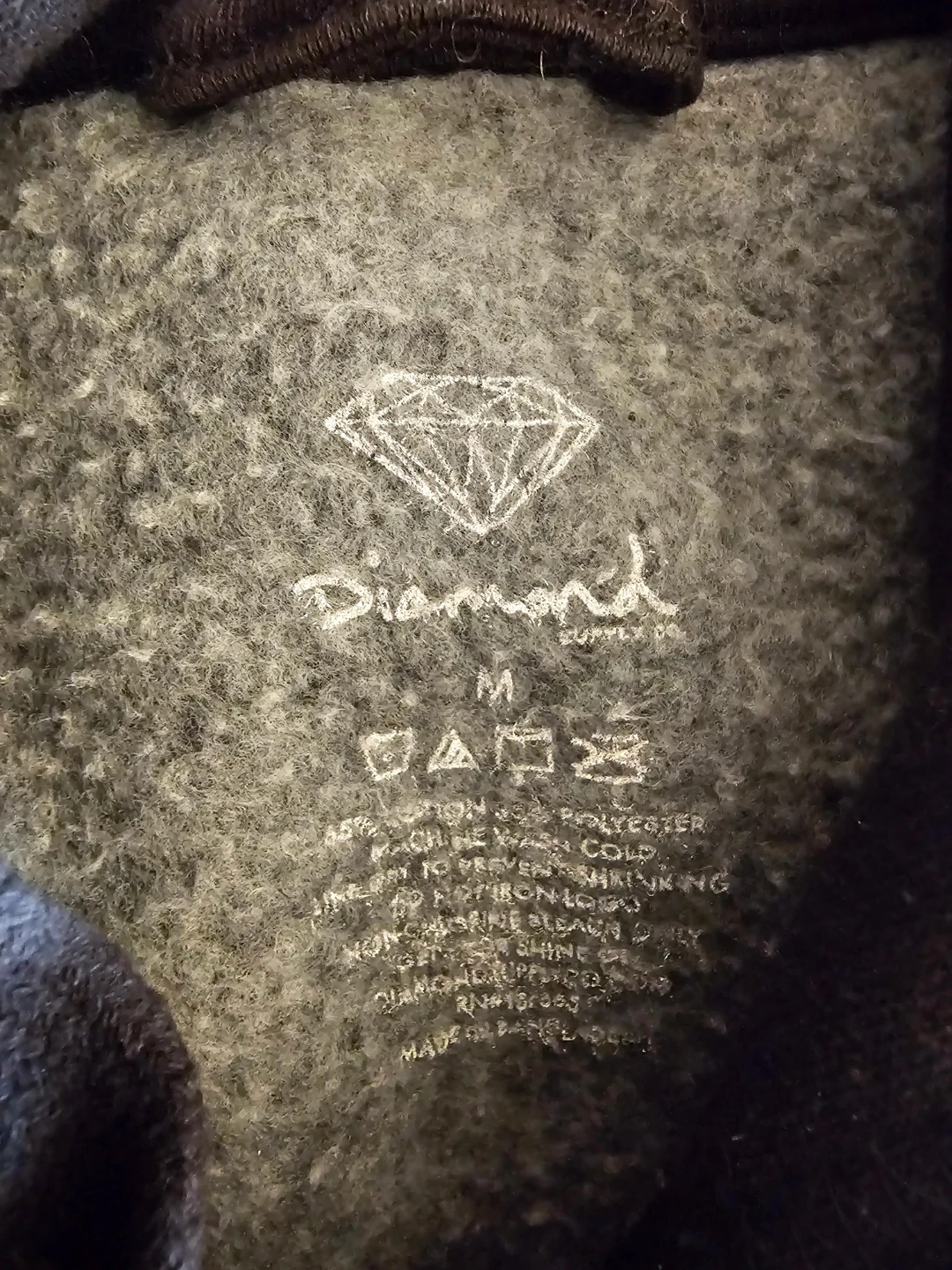 Diamond Supply Co. hoodie in black. Size medium. It's made of 60% cotton and 40% polyester. Care instructions: machine wash cold, do not iron logo, use non-chlorine bleach only, tumble dry low.
