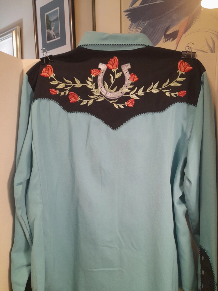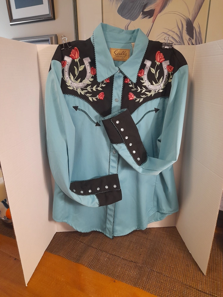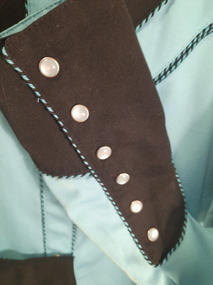Here's a lovely Scully Western shirt in a striking turquoise and black colour combination! It features beautiful embroidery, adding a touch of elegance to the classic western style