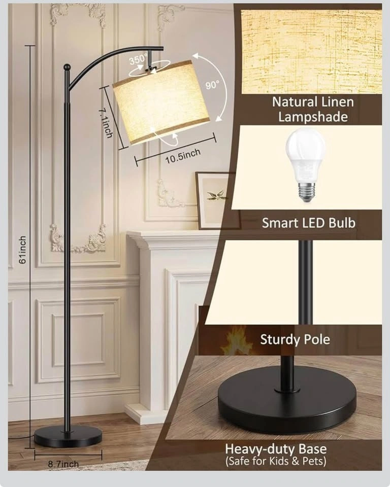 Brand new floor lamp with a dimmable, industrial arc design. Features a WiFi LED smart bulb, compatible with Alexa and Google Home. Suitable for living rooms and bedrooms. Available in multiple colors. This reading lamp is black.
