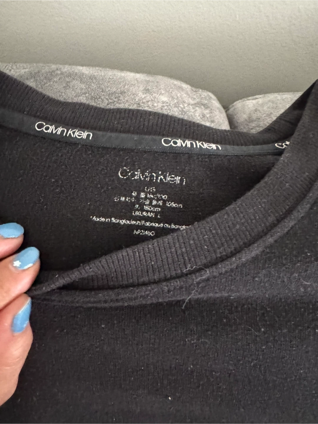 Calvin Klein black crew neck sweatshirt. Made in Bangladesh. Size L. Cotton blend material. A comfy sweater for everyday wear!