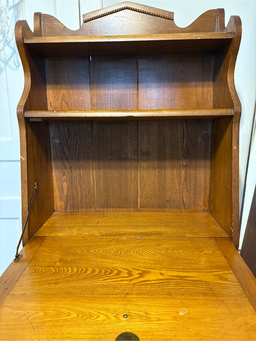 This vintage secretary desk is made of solid wood and features multiple shelves for storage. It has a drop-down writing surface with a small keyhole for security. This piece offers a charming way to organize your space. It has scratches and marks but good working condition. Measurements: 60”* 27”*11.5” (inches)