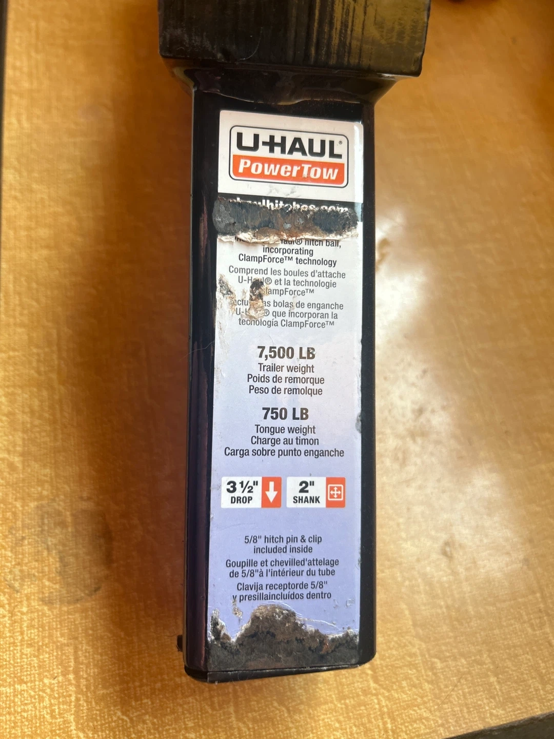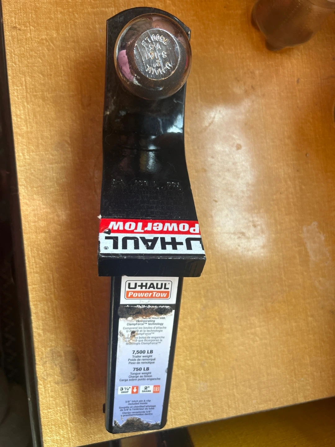 Selling a U-Haul PowerTow hitch ball mount! It has a trailer weight capacity of 7,500 LB and a tongue weight capacity of 750 LB. The drop is 3 1/2" and the shank is 2". Also includes a 5/8" hitch pin and clip. Only used once for pulling a trailer when I moved.