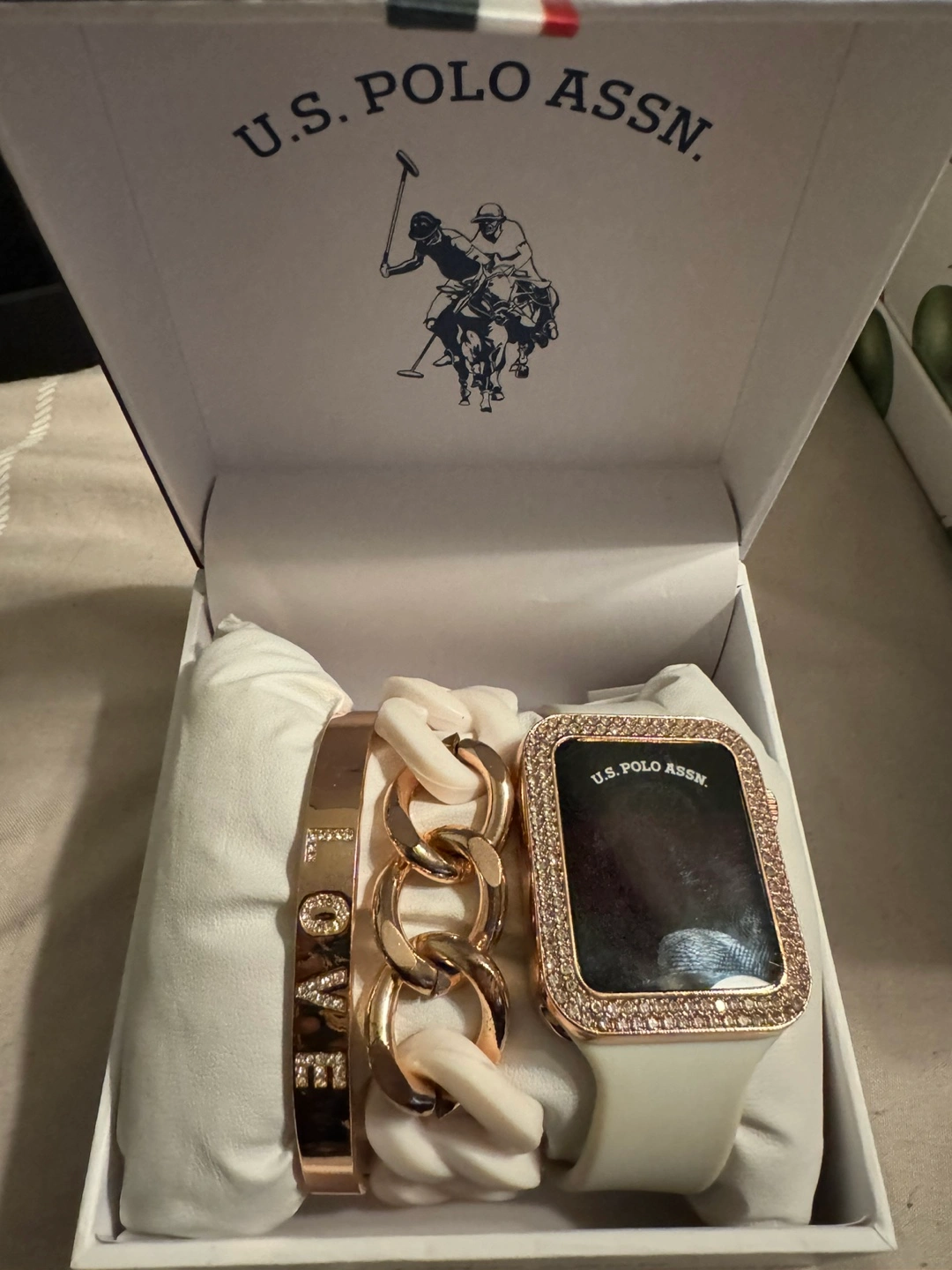 White watch and bracelet set with rose gold accents. Comes in a box.