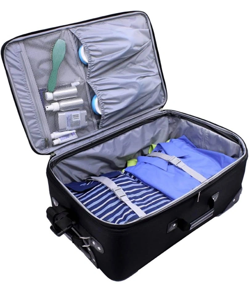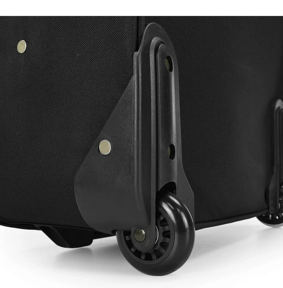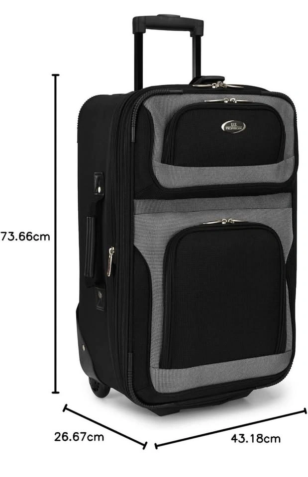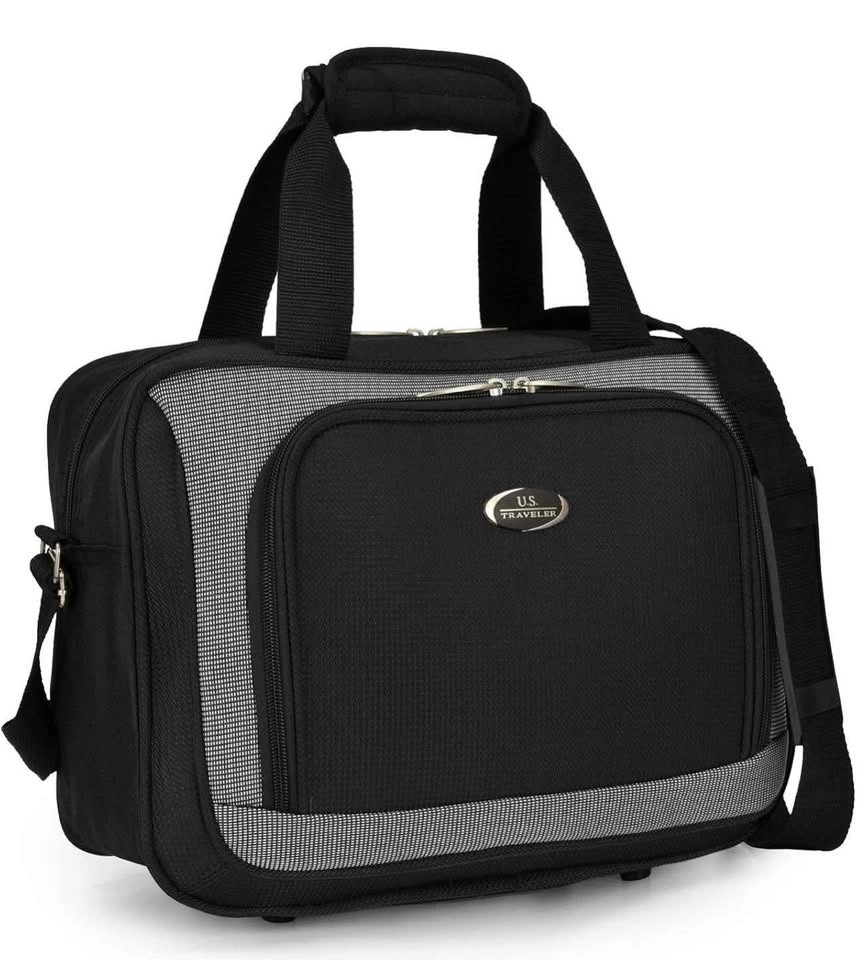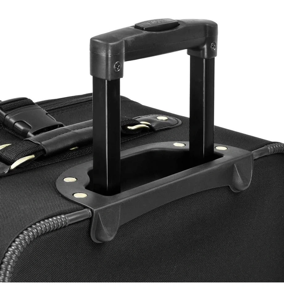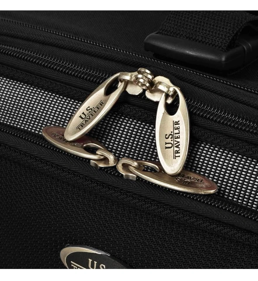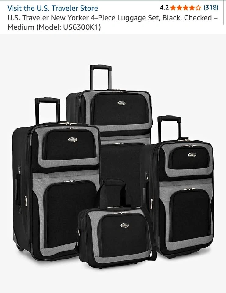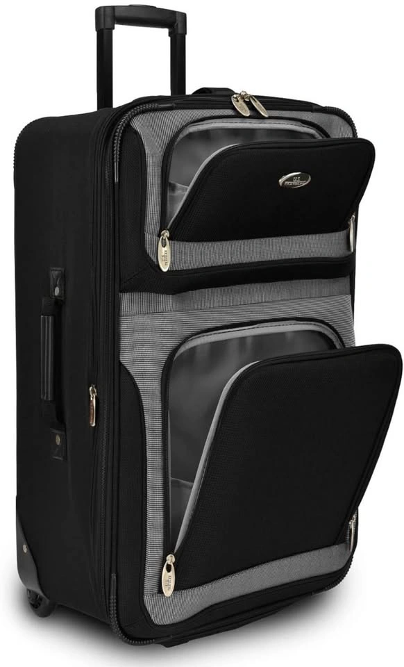 108New and sealed U.S. Traveler New Yorker Collection 4-piece luggage set in black. Constructed of lightweight and durable tear-resistant material. Features dual top and side carry handles with a bottom grip, adjustable add-a-bag strap, light gray interior lining, tie down straps, interior zippered mesh pocket, and dual shoe pockets. Expandable for 25% more packing capacity. Has an internal retractable push-button handle system and inline skate wheels. Multiple front zippered pockets.