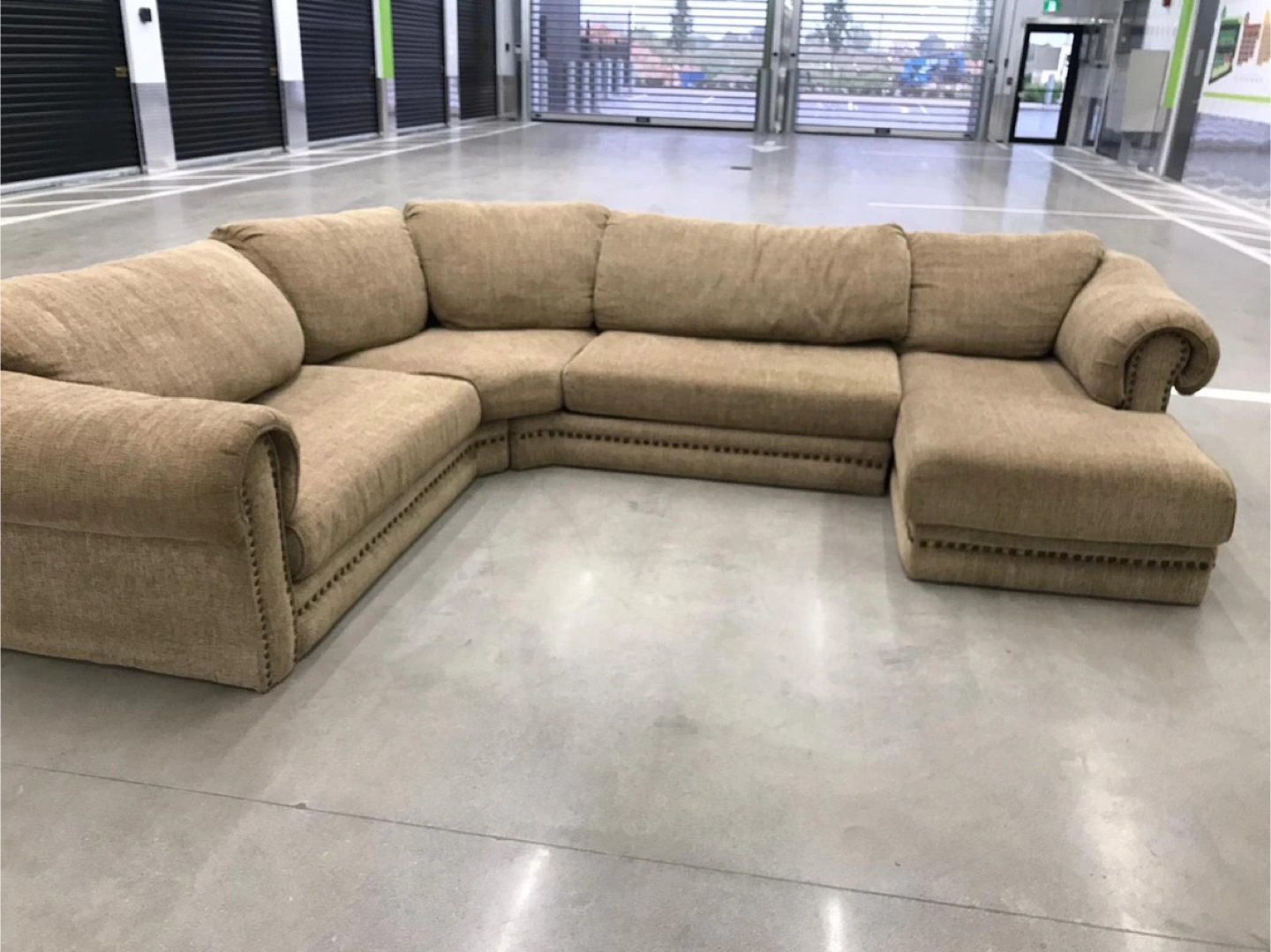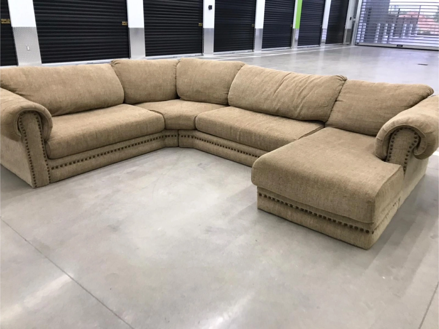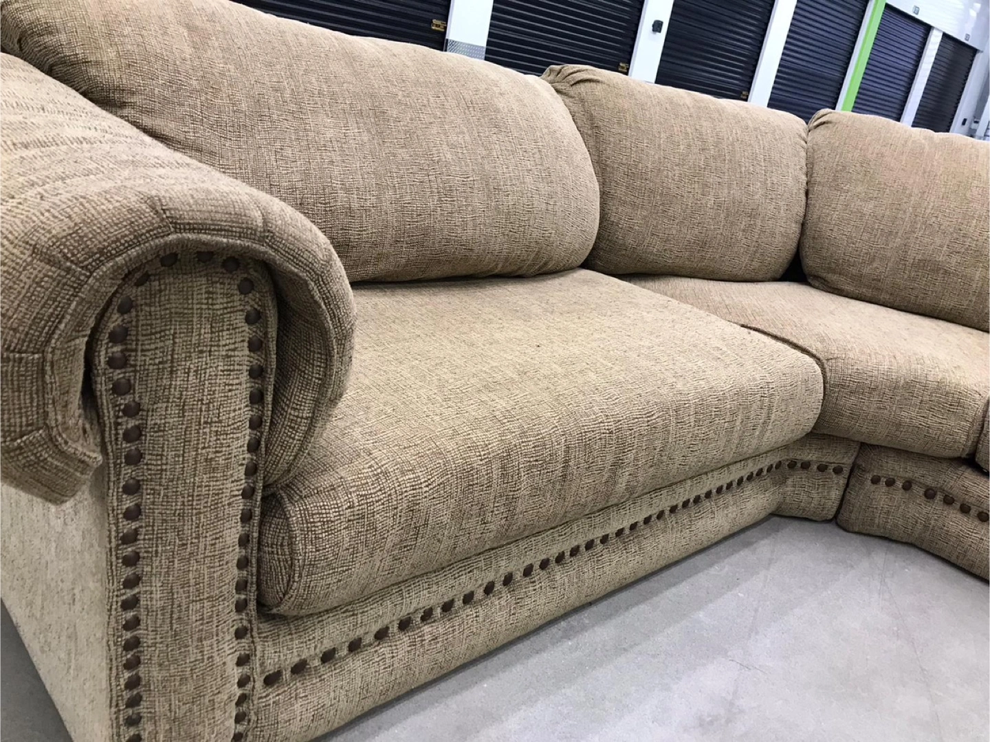 A large sectional sofa. Features a U-shape. Soft-looking cushions. Armrests are curved with decorative rivets. Think of all the cozy times you could have snuggling on this sofa. Excellent condition. Huge comes in three big pieces , very clean no damages or stains ! Smoke and pet free