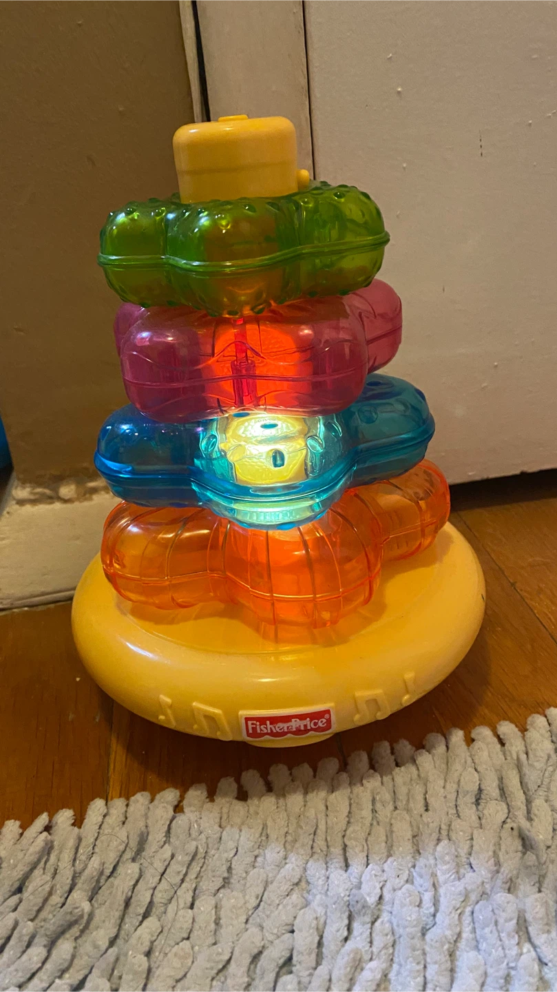 Fisher-Price stacking toy with colorful, translucent rings that light up. The base features music notes and a Fisher-Price logo. It's a fun toy for little ones to stack and play with!