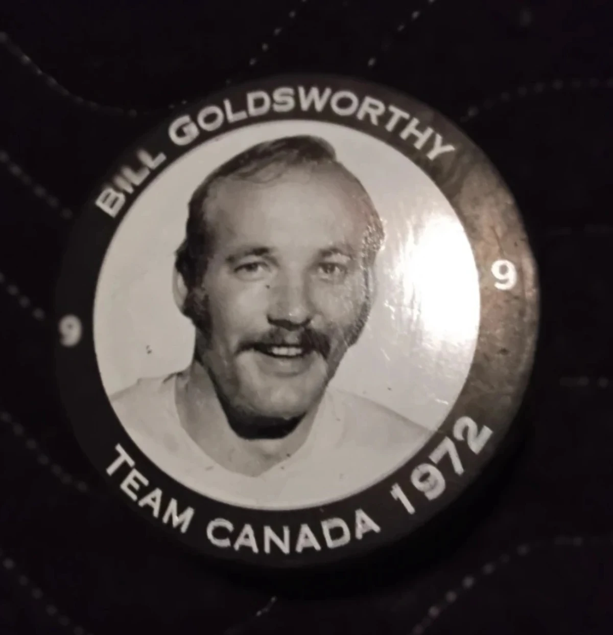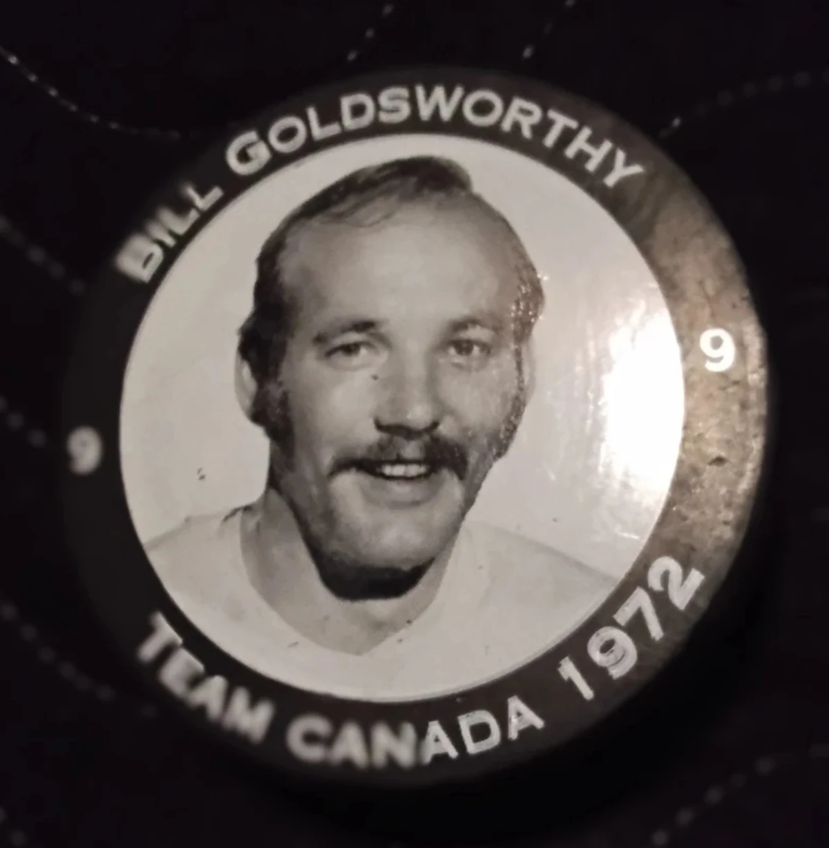 Selling a Team Canada 1972 hockey puck. It features the 'Team of the Century' logo on one side and a portrait of Bill Goldsworthy on the other. A great piece for any hockey fan!
