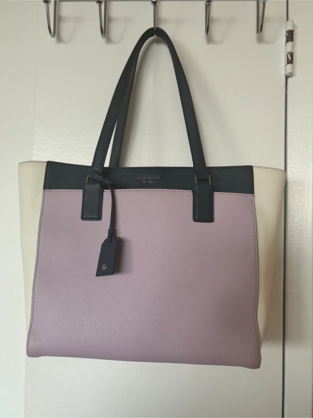 Selling a Kate Spade tote bag in a lovely lavender, cream, and black colour combination. It's in great shape and ready for a new home! Perfect for everyday use or as a stylish work bag.