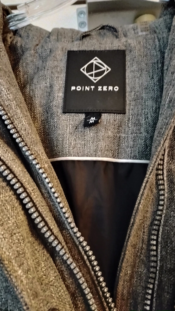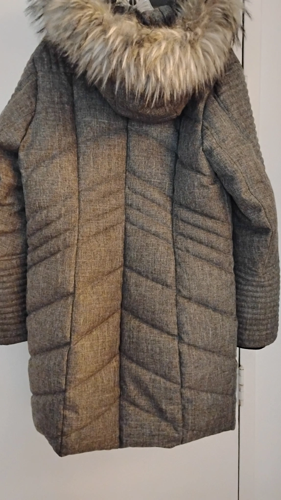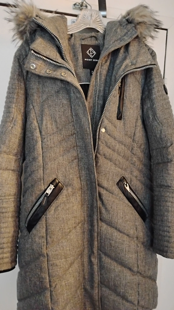 Stylish winter coat. Grey, quilted design. Features faux fur trimmed hood, zipper and snap closure. Multiple pockets. Size M.