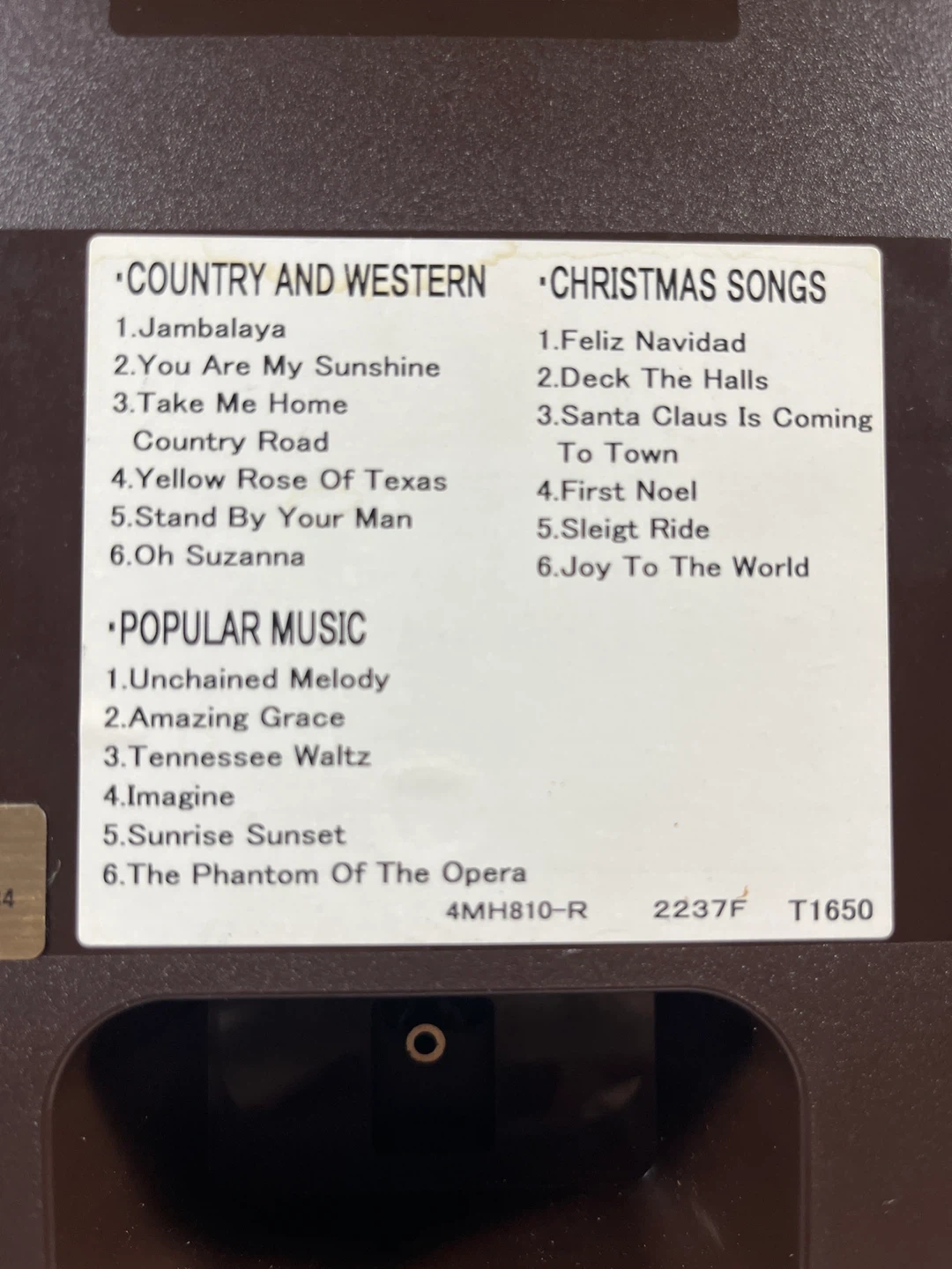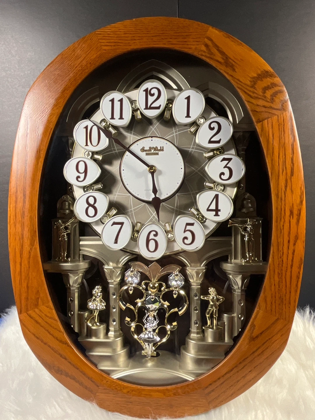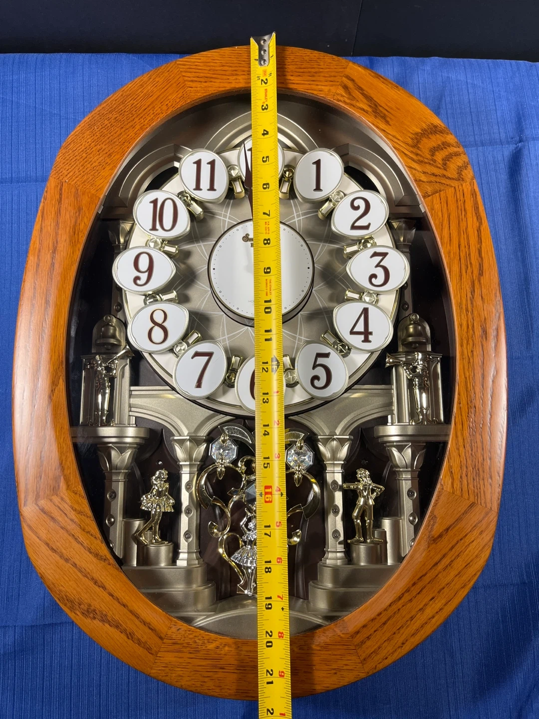 This Rhythm-A-Chime musical motion clock features a wood-look oval frame and plays popular melodies. It has selectable music options for Country & Western, Christmas Songs, or Popular Music. The clock face displays Roman numerals and has animated figures that move. Operates on batteries.