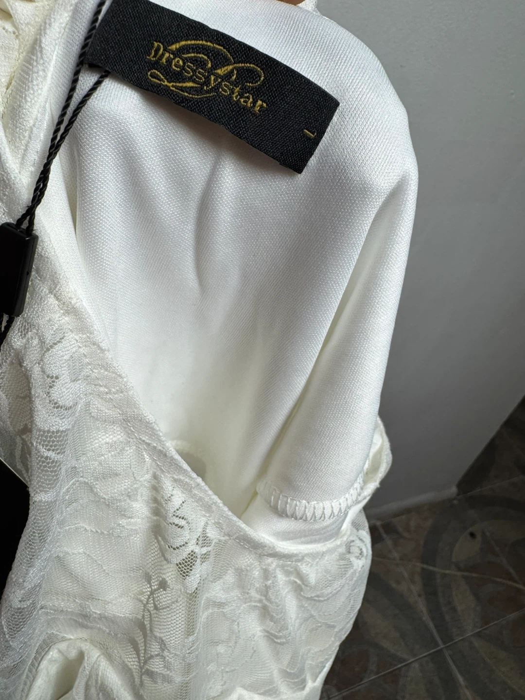This Dressystar dress comes in white with a lace overlay. It's a midi length with three-quarter sleeves. Size is L.