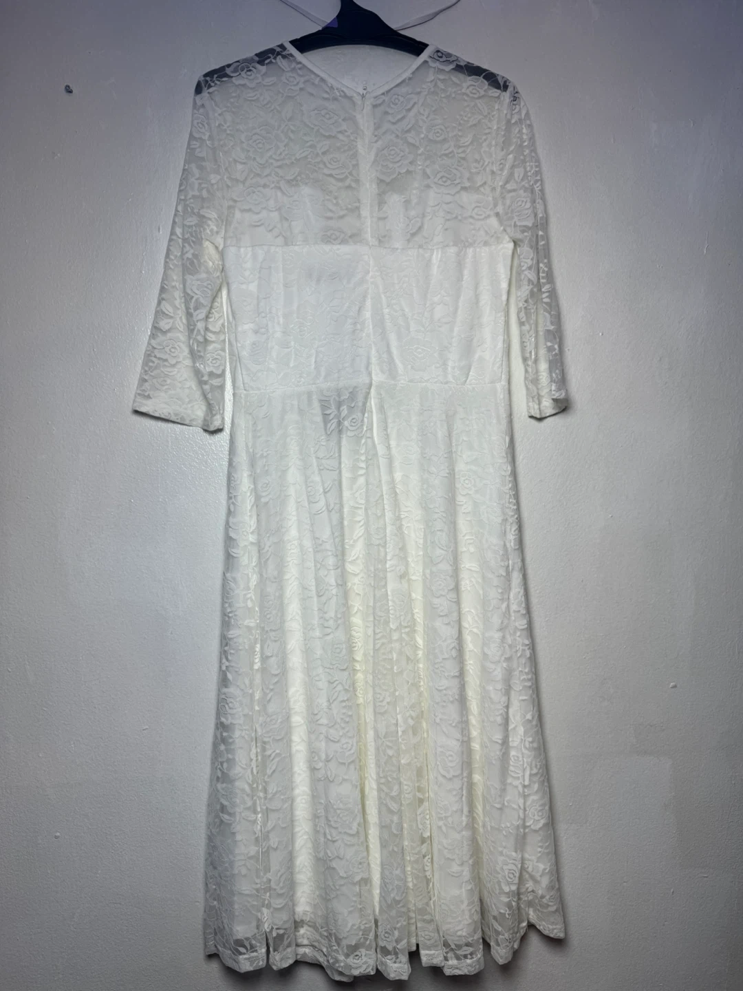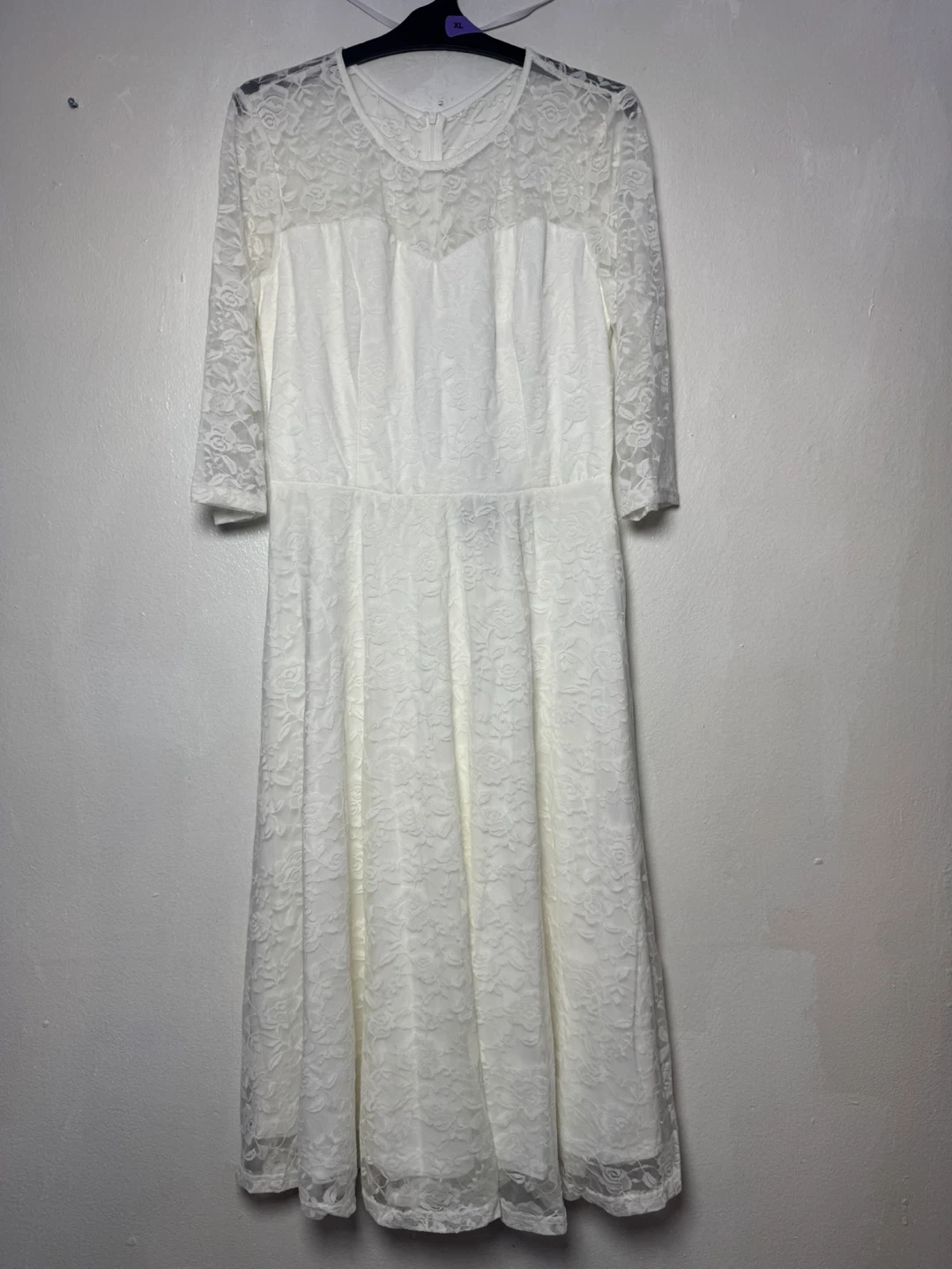 This Dressystar dress comes in white with a lace overlay. It's a midi length with three-quarter sleeves. Size is L.