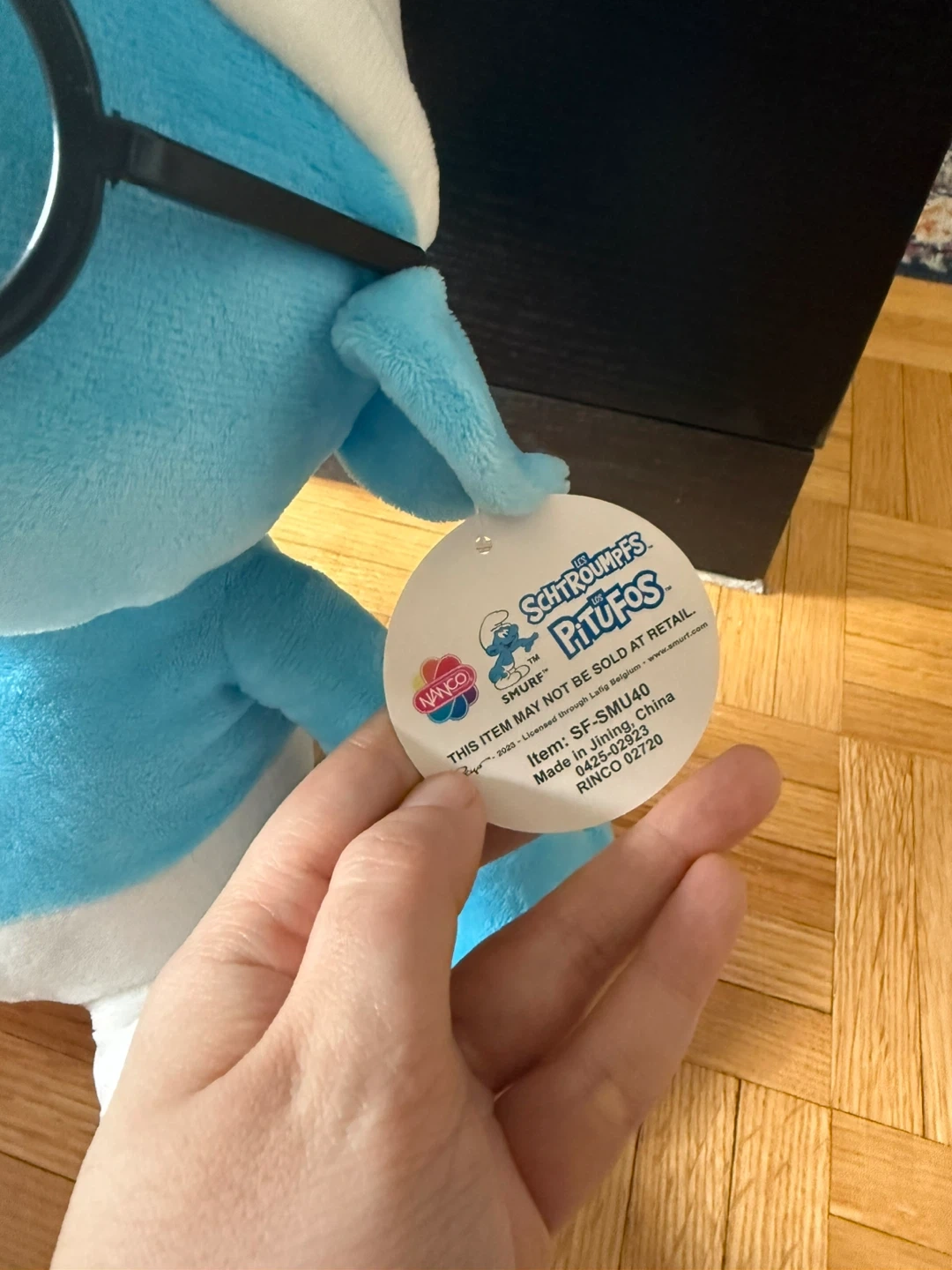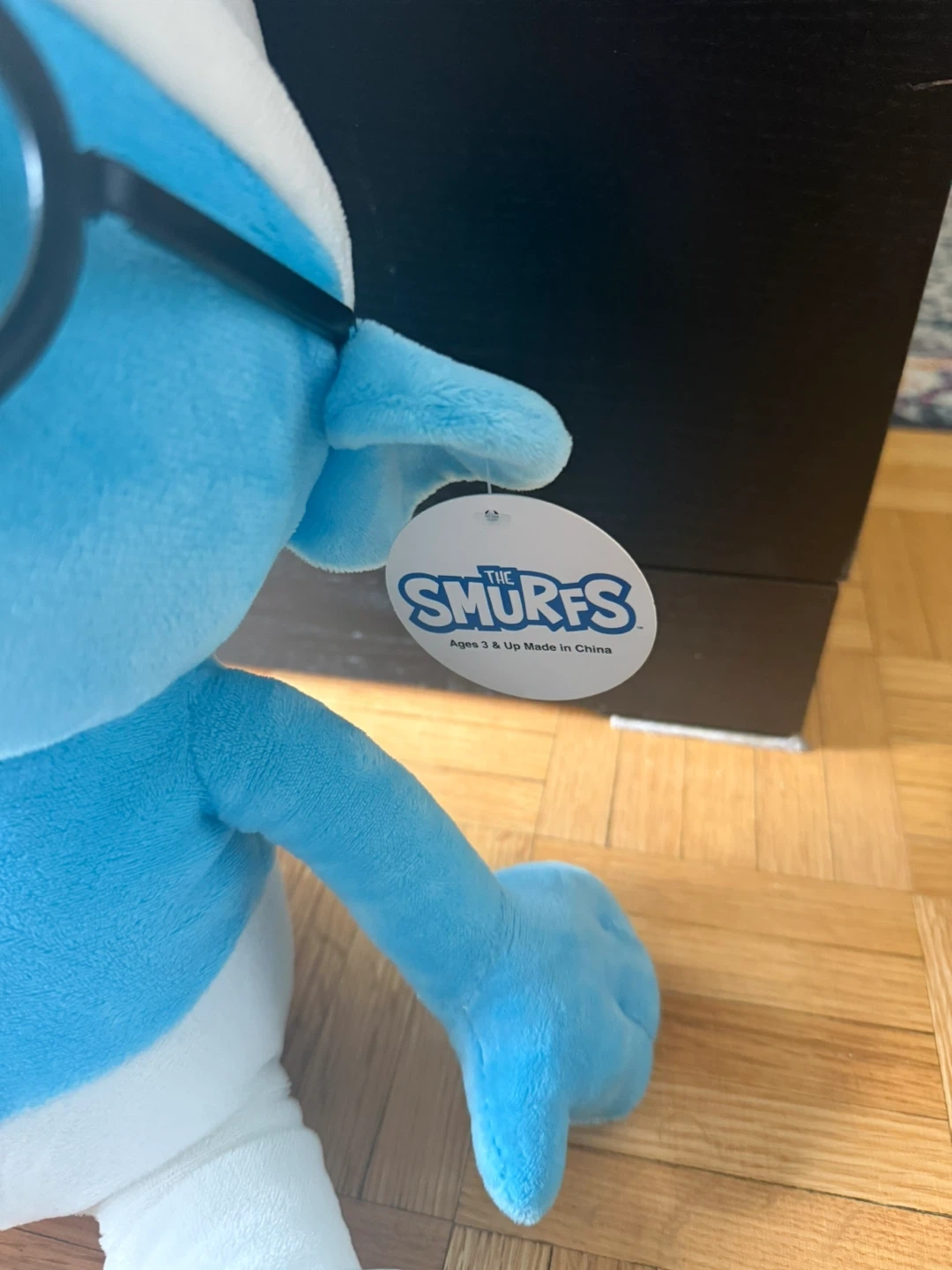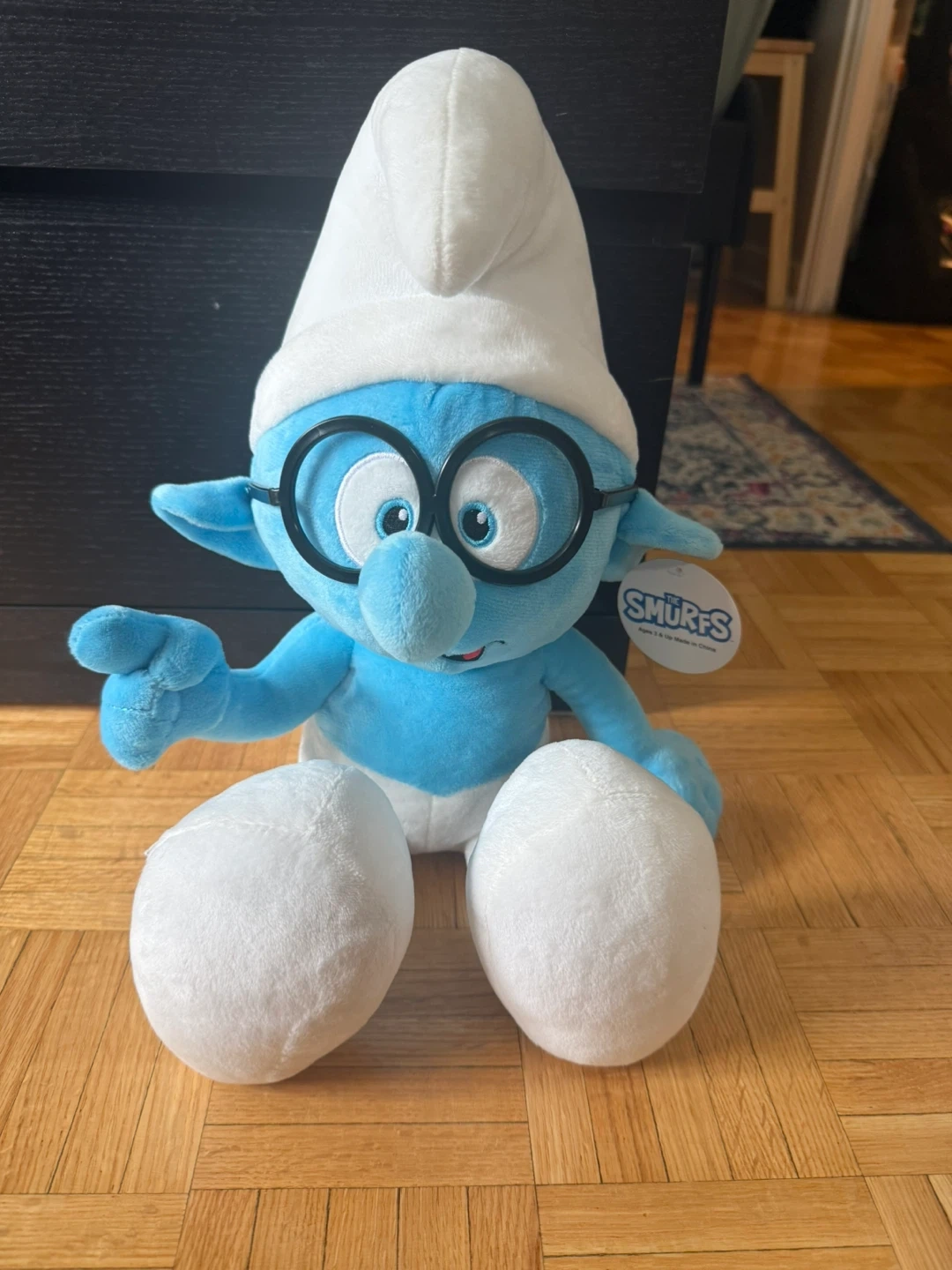 A soft blue plush toy of a Smurf wearing glasses and a white hat. This item is suitable for ages 3 and up.