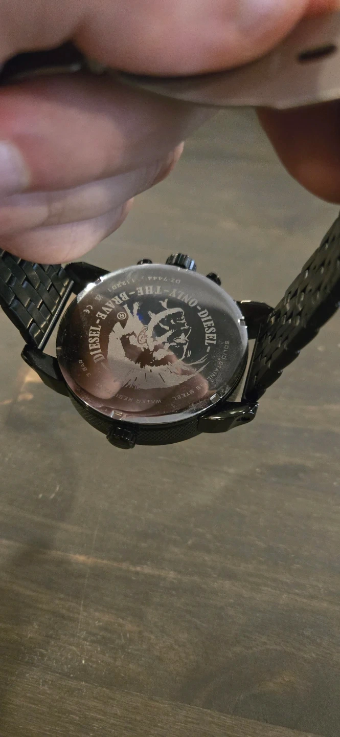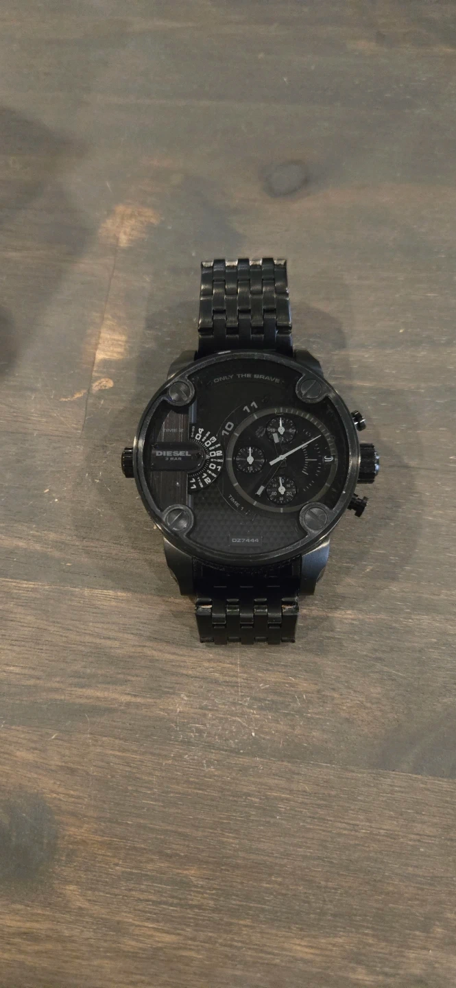 This is a black Diesel watch. It features a stainless steel band and is water-resistant up to 3 bars. It's a stylish accessory for everyday wear.