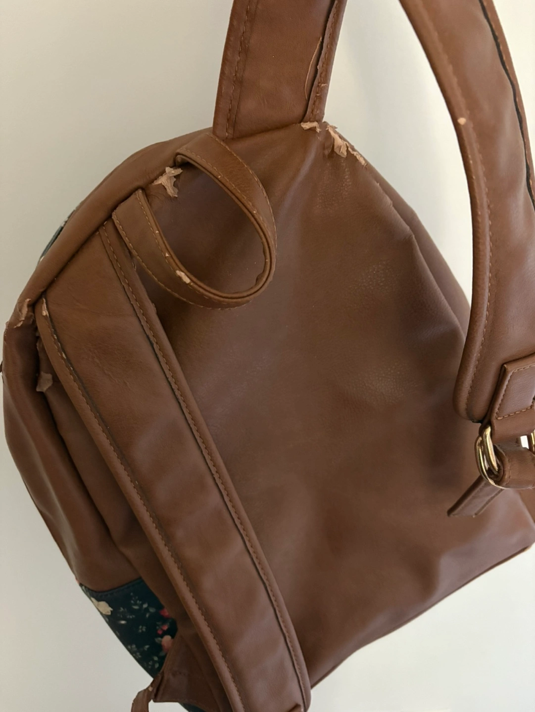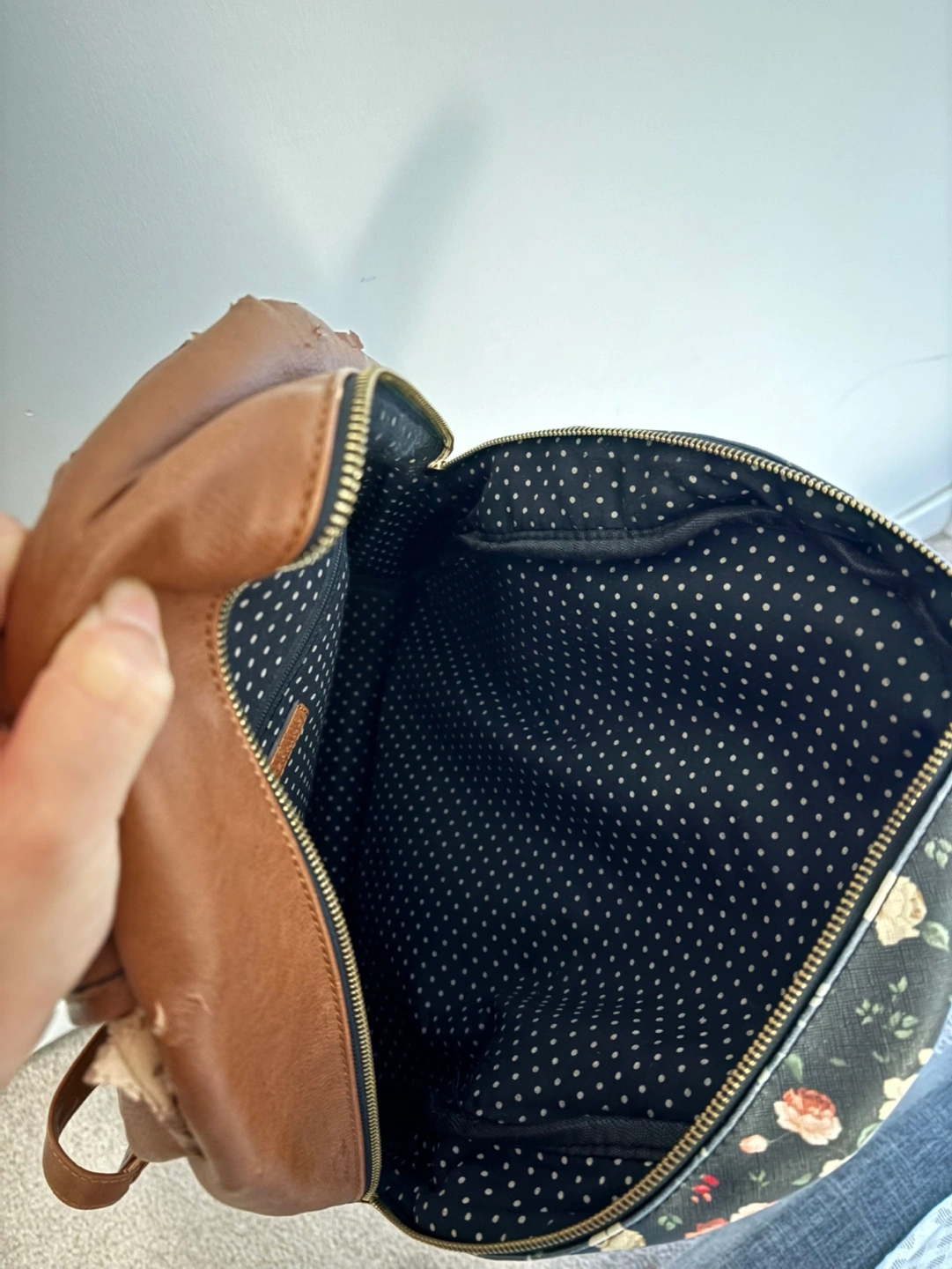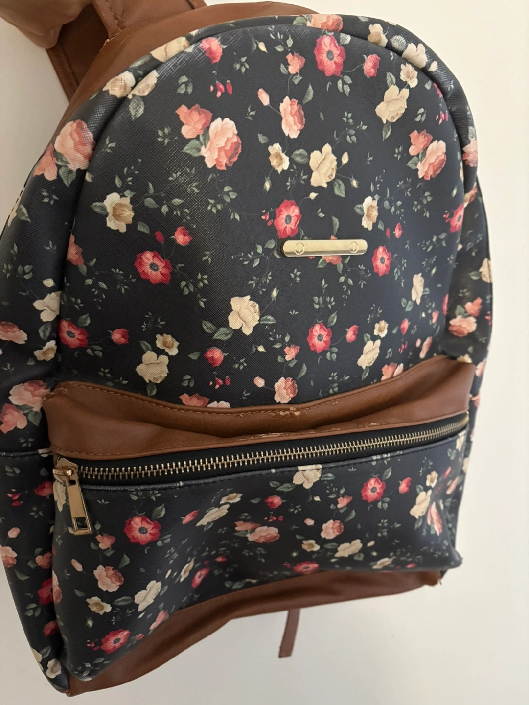 Black floral backpack with brown faux leather trim. Features a zippered pocket on the front, a large main compartment and multiple pockets on the inside. Comes with a brown faux leather adjustable strap.