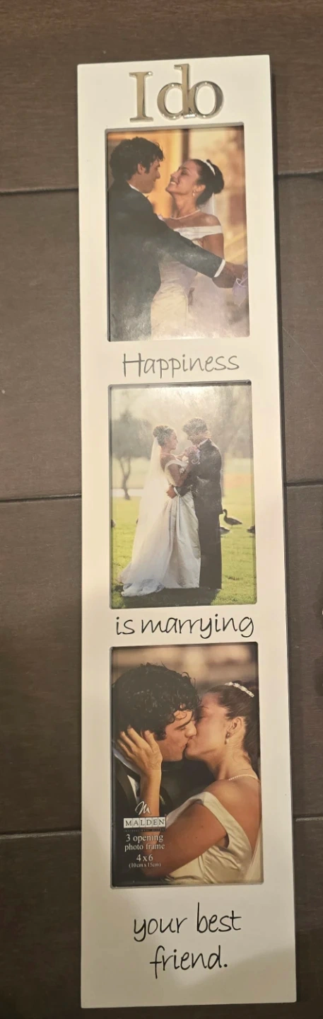 This Malden photo frame displays "I Do Happiness is marrying your best friend." It has three openings for 4x6 photos. The frame features a decorative beaded edge.