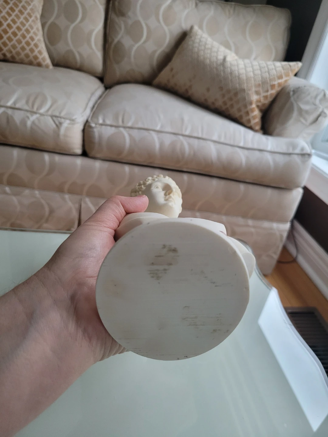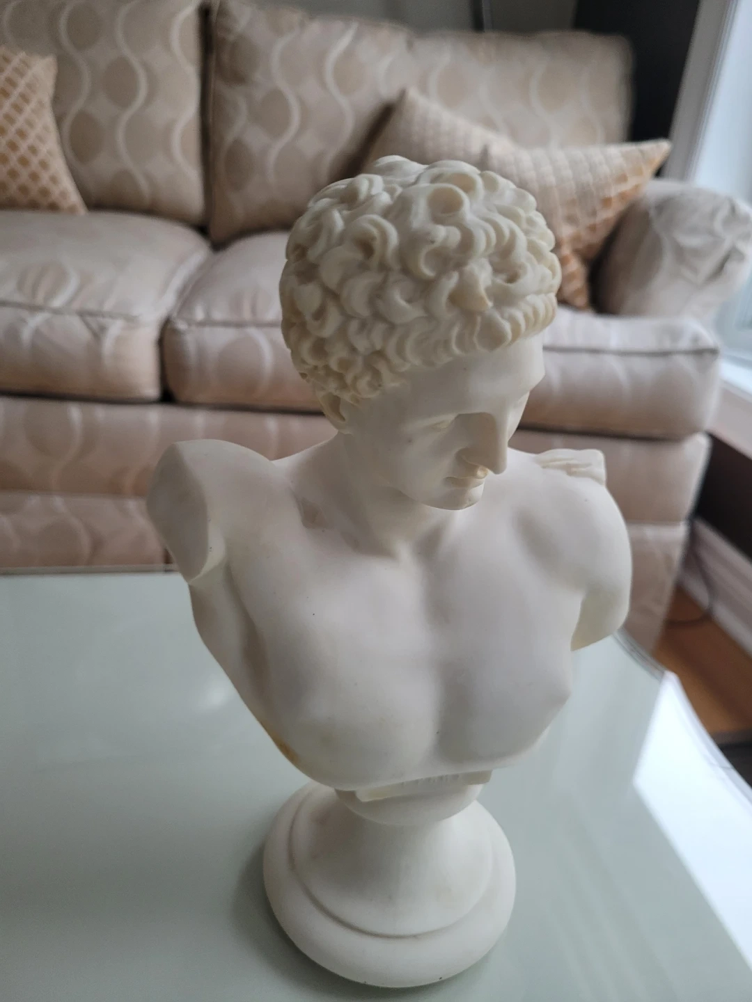 This is a marble like bust of Hermes. It's a decorative piece for your home. The base has the name 'ΕΡΜΗΣ' inscribed, which is Greek for Hermes.