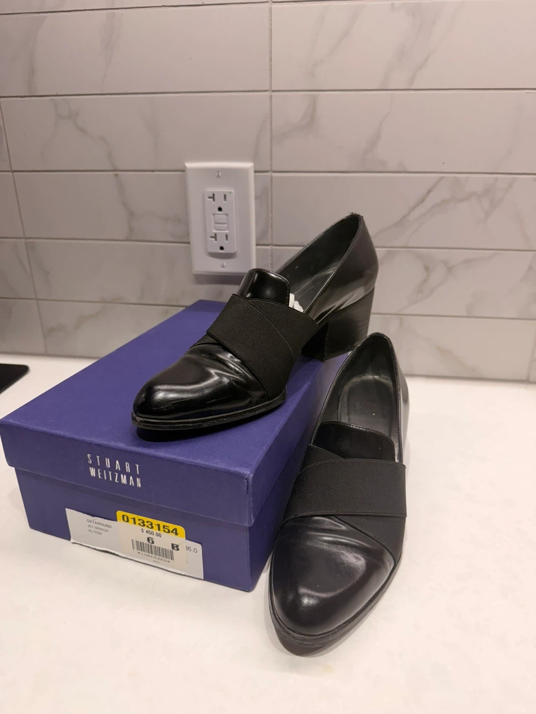 These are black leather Stuart Weitzman loafers. They feature a black elastic strap across the vamp. Includes original box. Leather material.