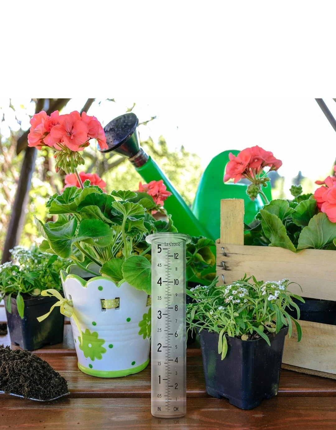 This is a La Crosse rain gauge. It measures up to 5 inches of rain. It's made of clear plastic with measurement markings in both inches and centimetres. Track your rainfall easily with this durable gauge!