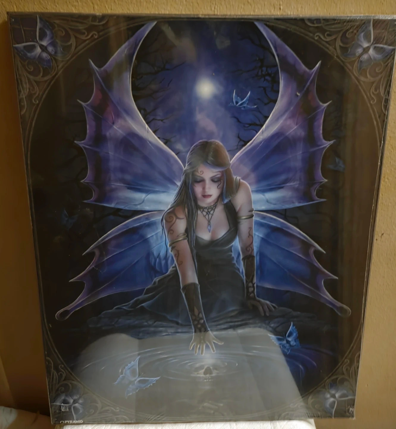 This Pyramid gothic fairy art canvas print features a mystical scene with a fairy and butterflies. It's a striking piece of art for your home. The canvas measures approximately 16" x 20".