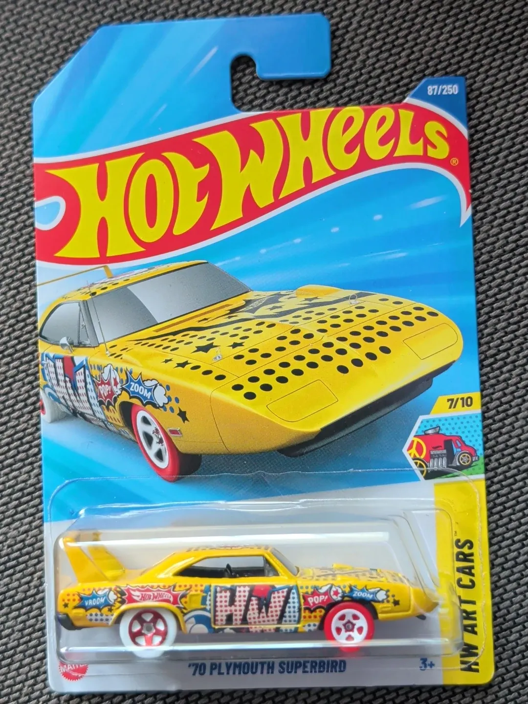This is a Hot Wheels '70 Plymouth Superbird die-cast car. It's a 1:64 scale model, part of the HW Art Cars series. This model is yellow with a pop art-style graphic design.