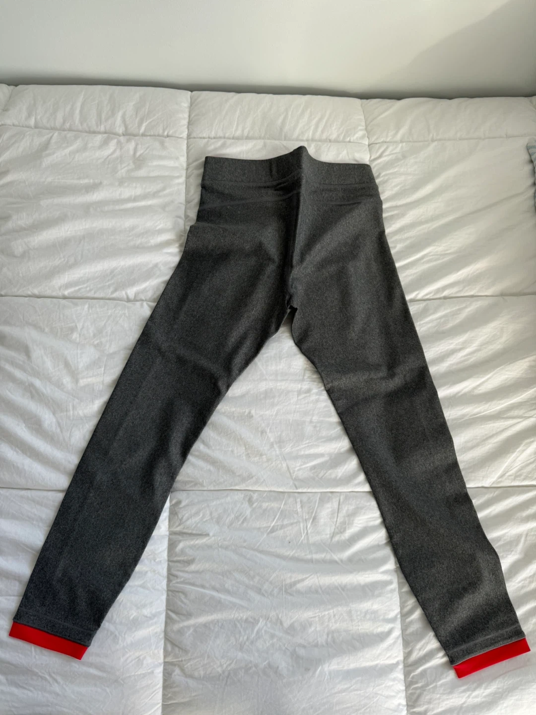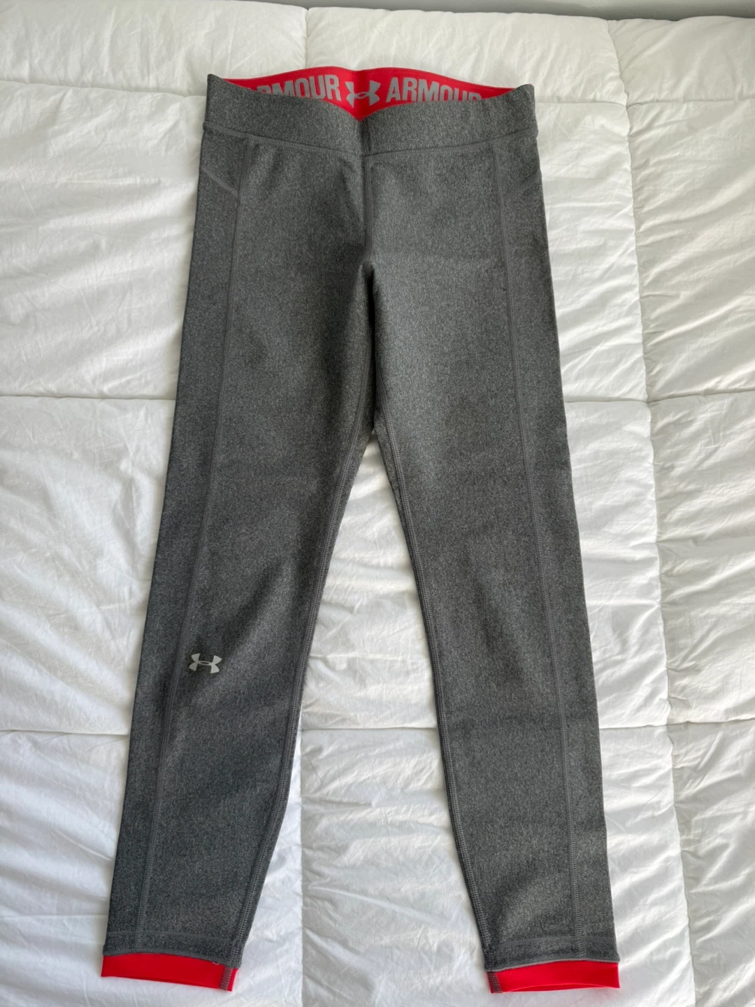 This Under Armour legging is a heathered grey with red trim at the ankles and waistband.