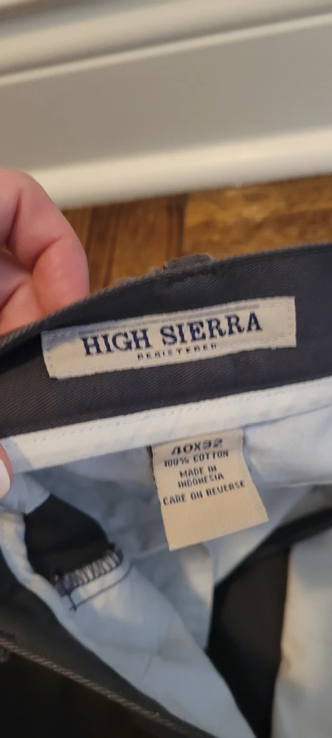 These are High Sierra dress pants. 100% cotton material. Made in Indonesia. Great for formal or casual wear!