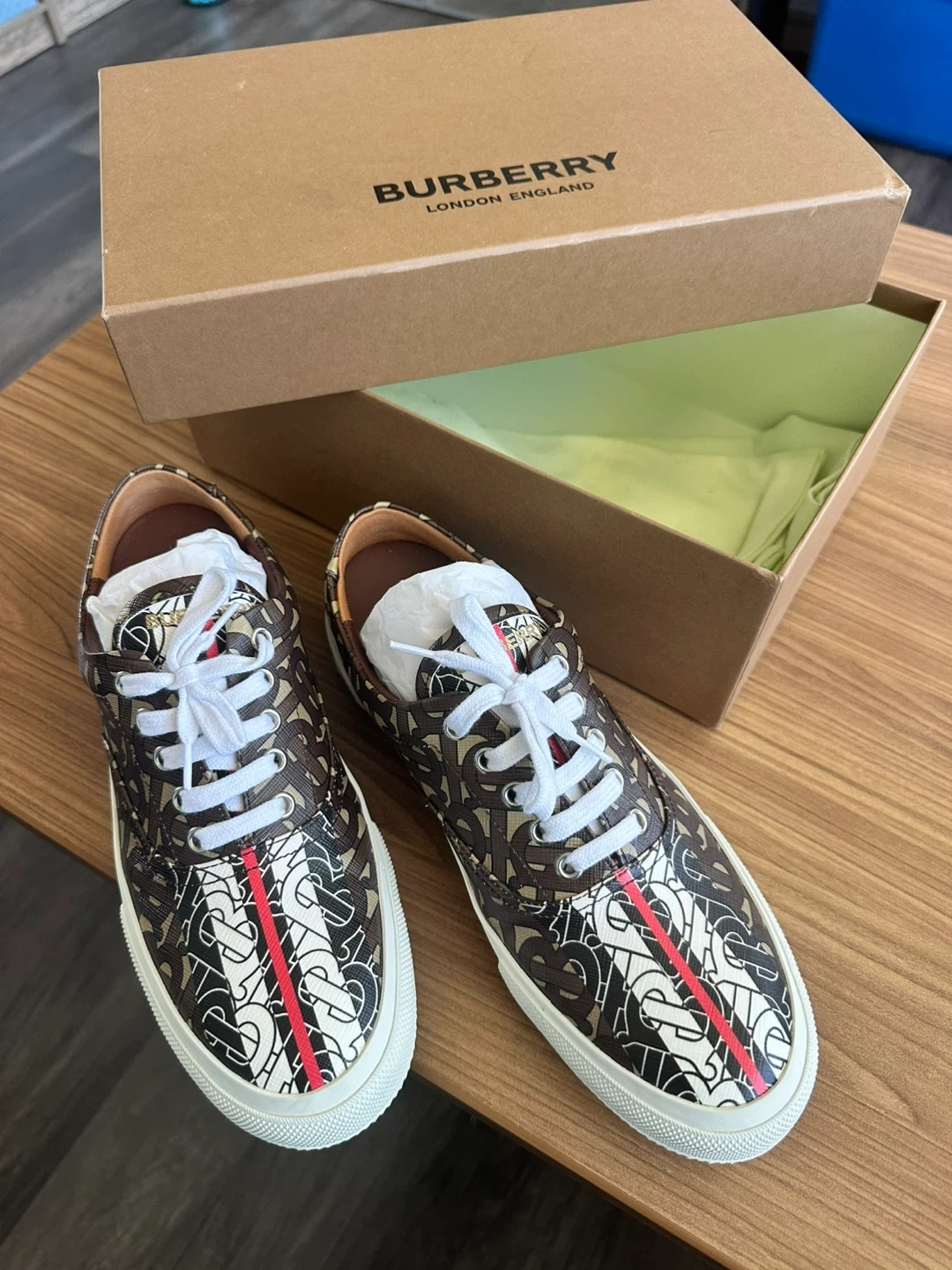 Burberry London England low top sneakers featuring the signature monogram print. Includes original box. Colour: Bridle Brown.