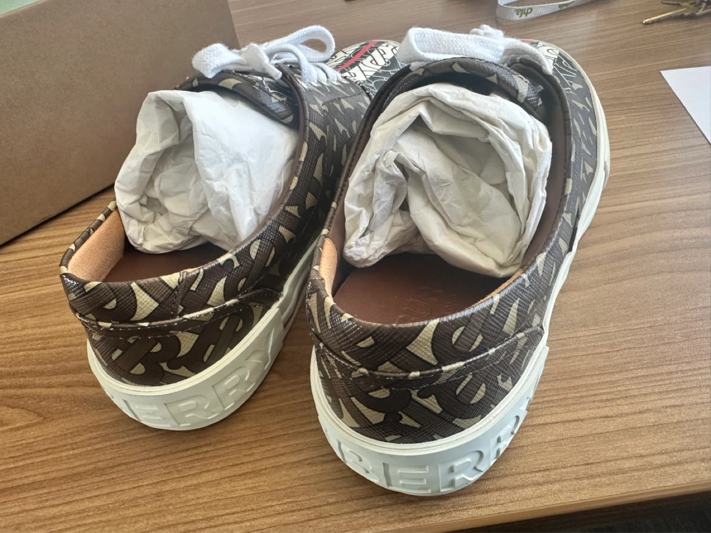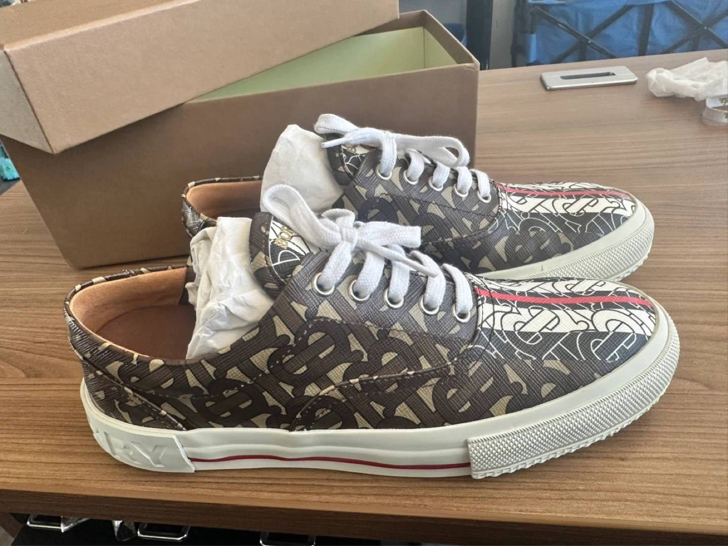 Burberry London England low top sneakers featuring the signature monogram print. Includes original box. Colour: Bridle Brown.