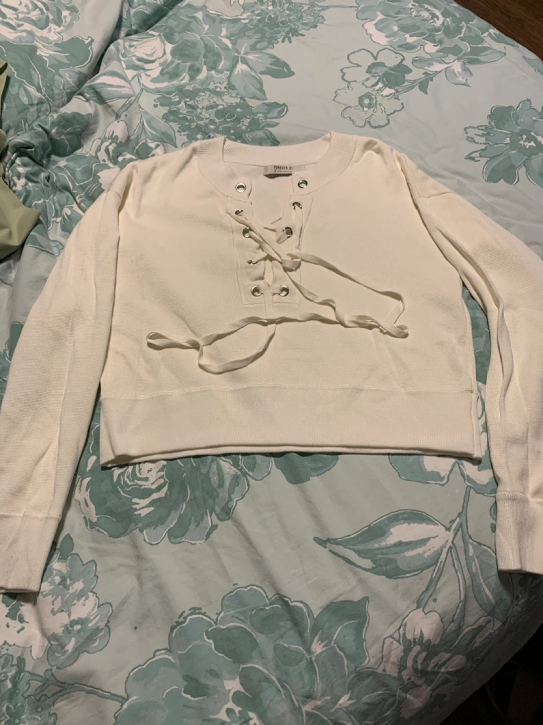 This is a cream-coloured, long-sleeved knit sweater from Forever 21. It features a lace-up neckline with grommets and a tie closure. It's a contemporary fit.