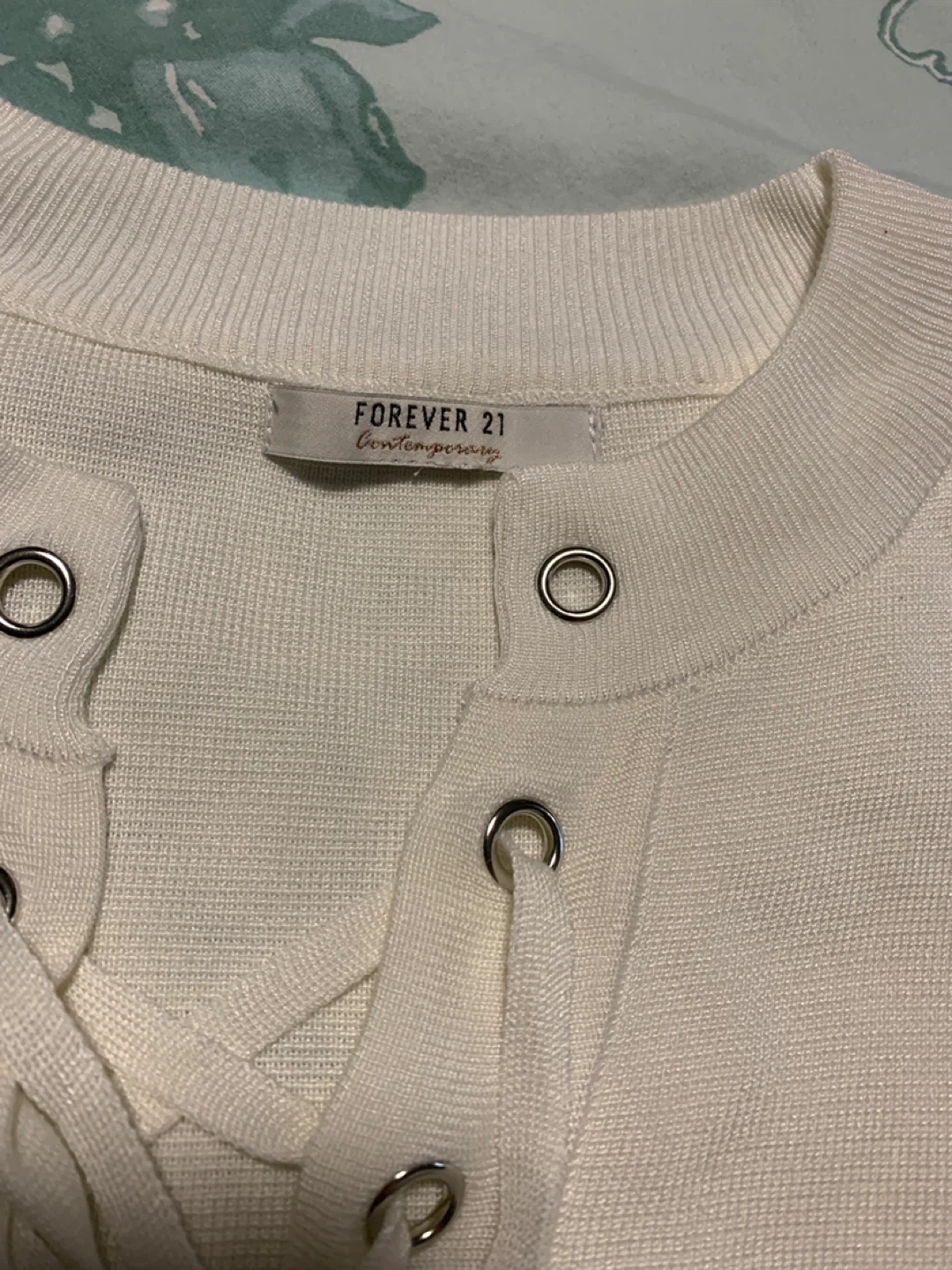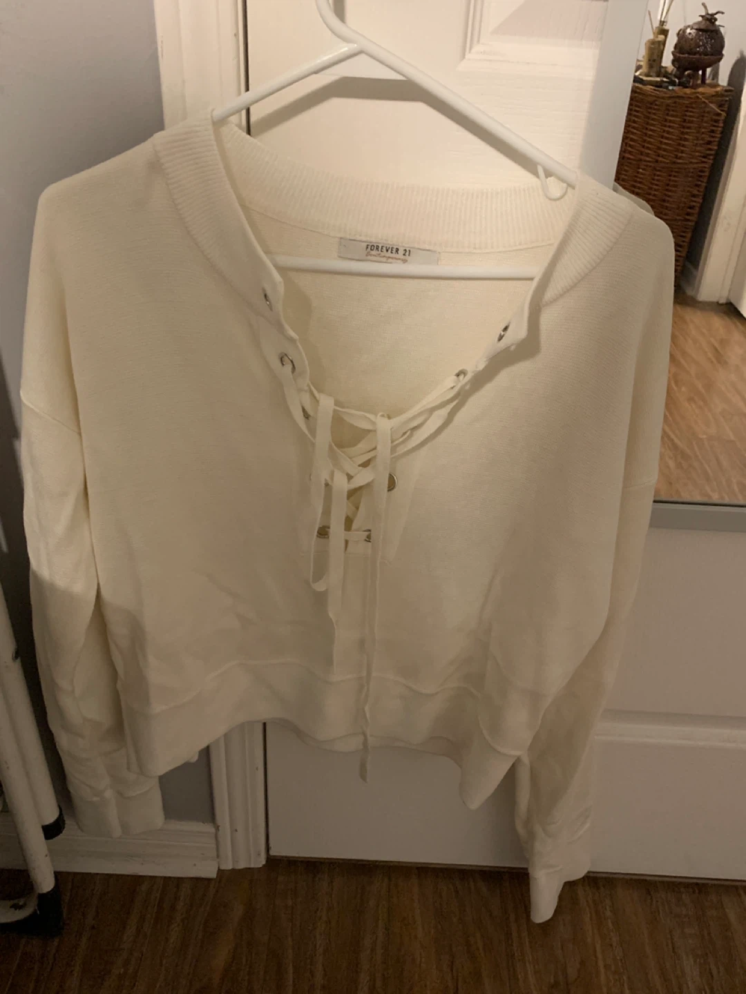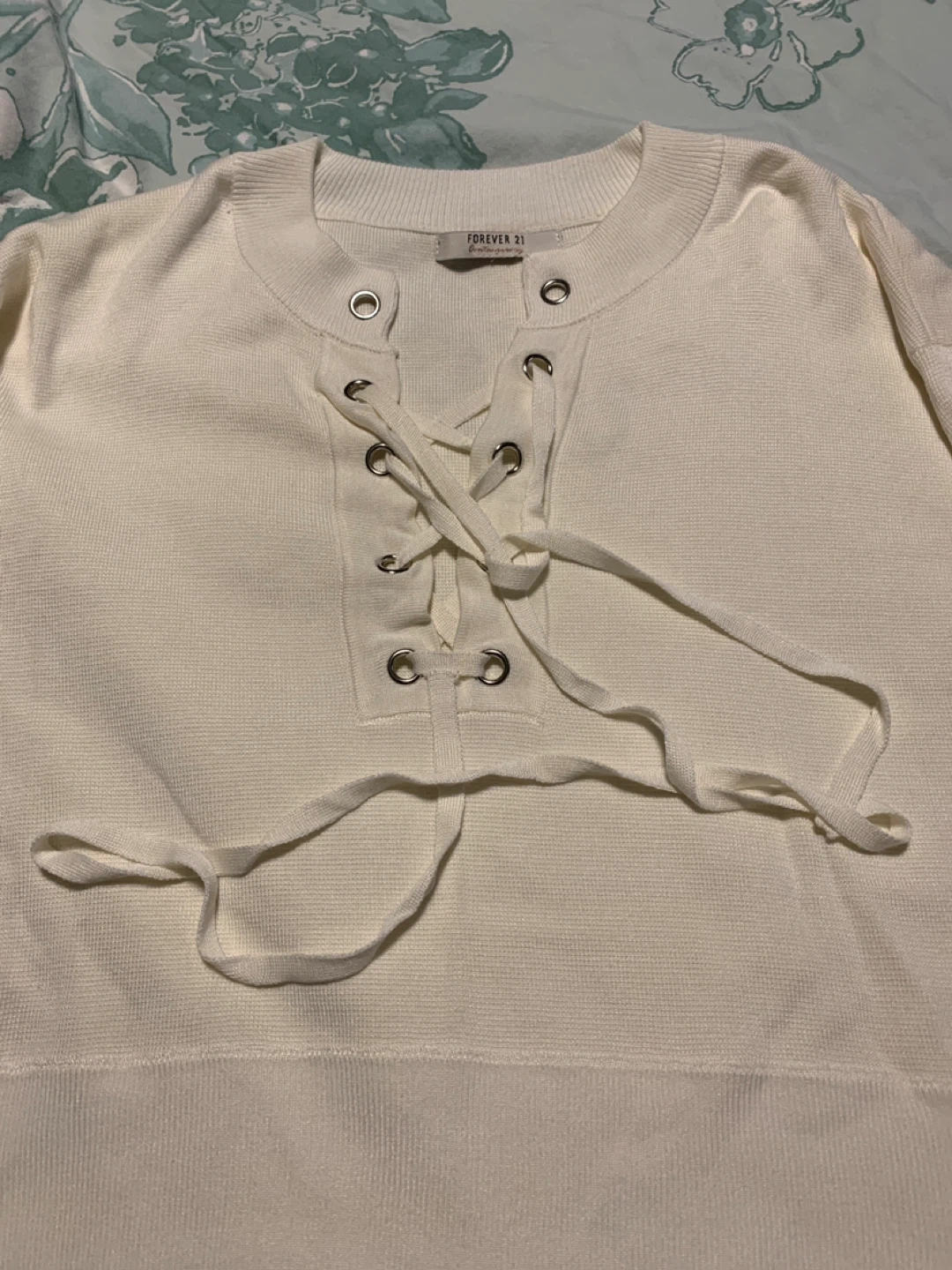 This is a cream-coloured, long-sleeved knit sweater from Forever 21. It features a lace-up neckline with grommets and a tie closure. It's a contemporary fit.