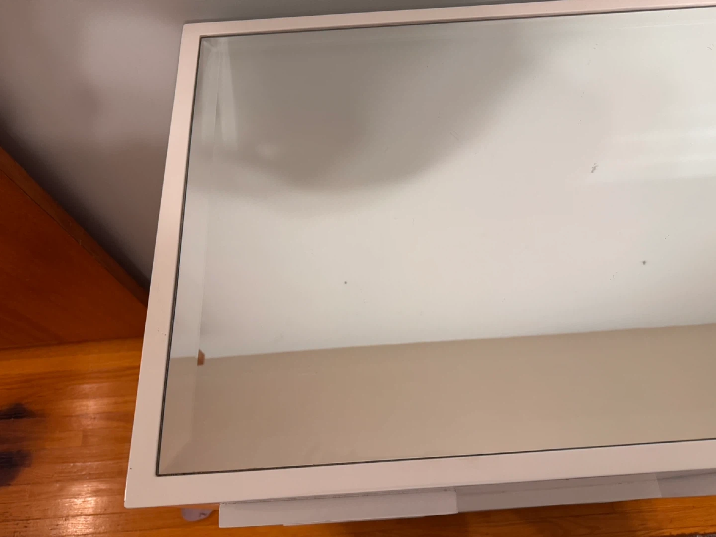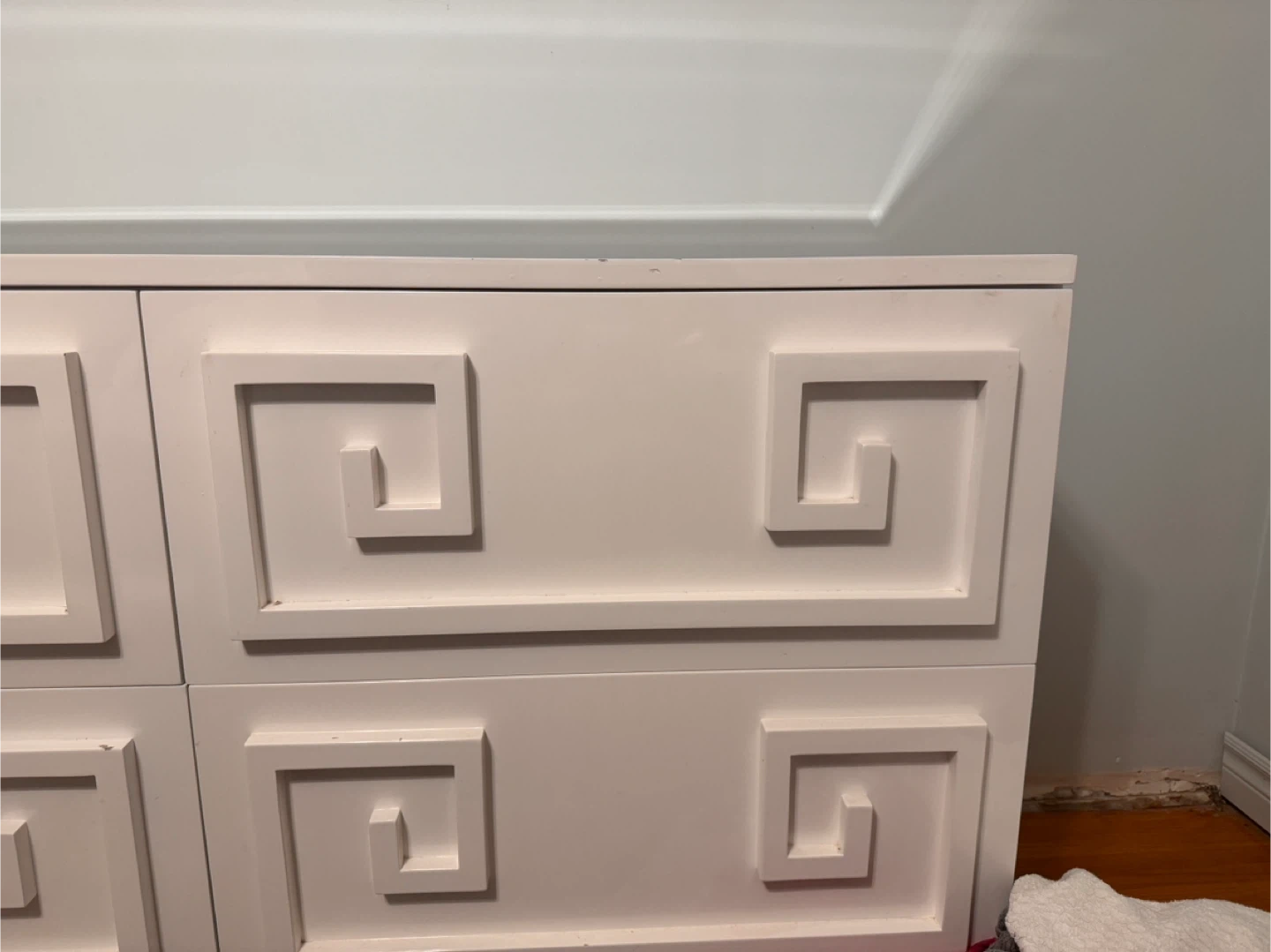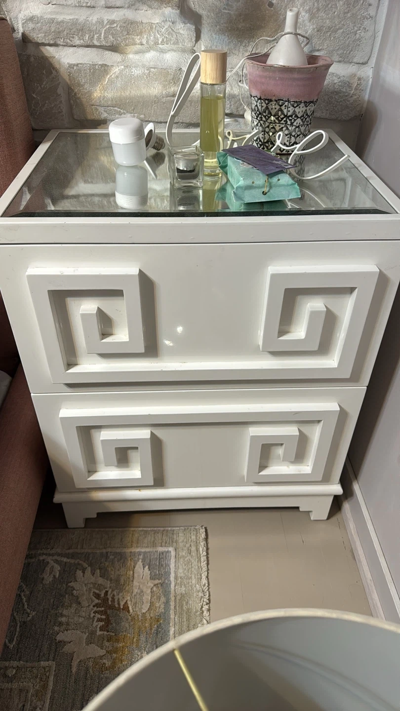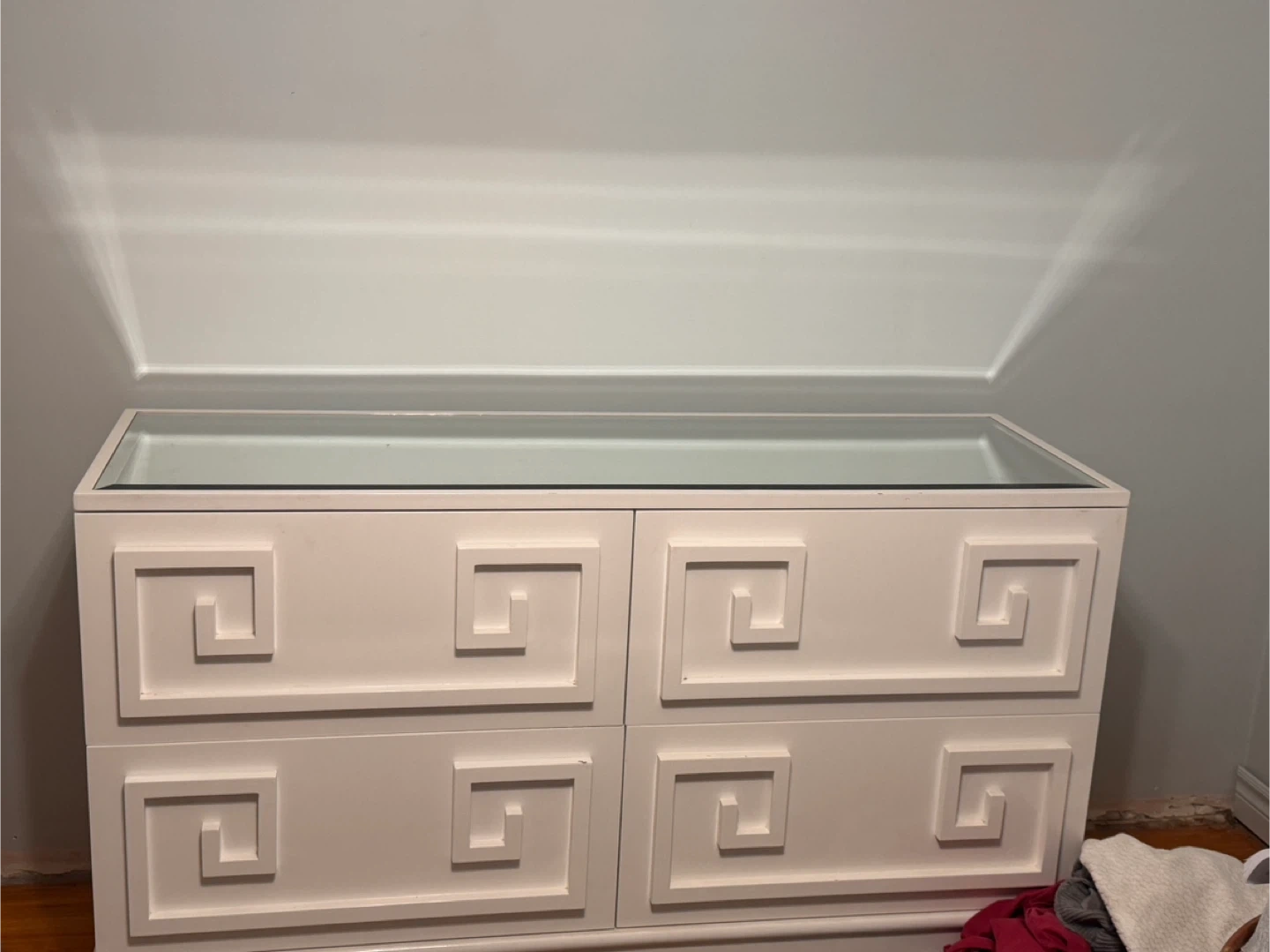 This white nightstand features a classic Greek key design on its two drawers. It has a mirrored glass top for a touch of elegance. It's a neat piece for beside the bed! The dresser has 4 deep drawers and can be used as a buffet in the dining room or split up doesn’t have to be used as a set I didn’t