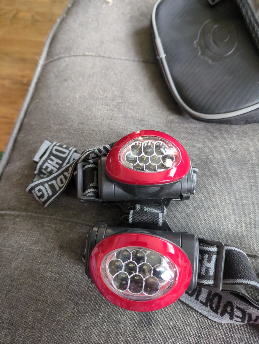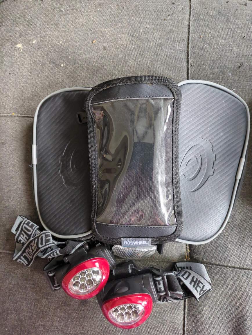 A set of bike accessories, including headlamps, a phone pouch, and a reflector. Great for enhancing visibility while enjoying an evening bike ride.