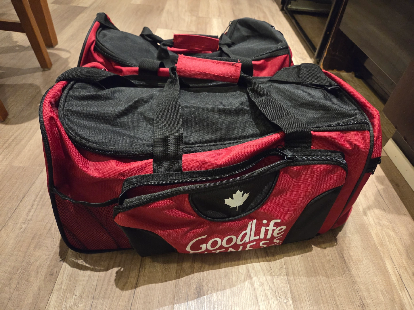 Selling a NEW GoodLife Fitness gym bag in red and black. It's in great shape and ready for your workouts at the gym or on the go! It has a spacious main compartment and a front pocket with the GoodLife Fitness logo.