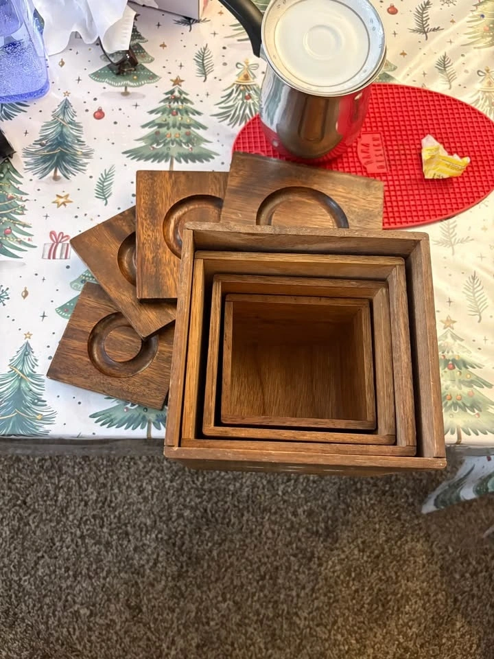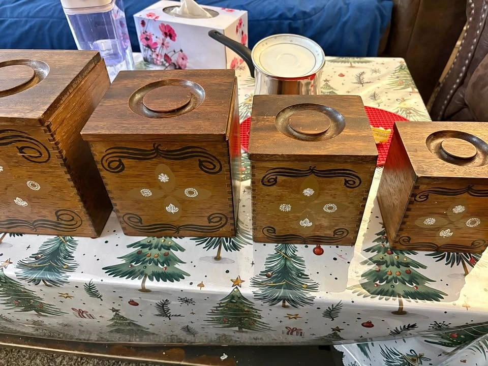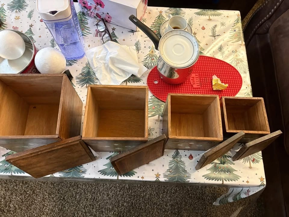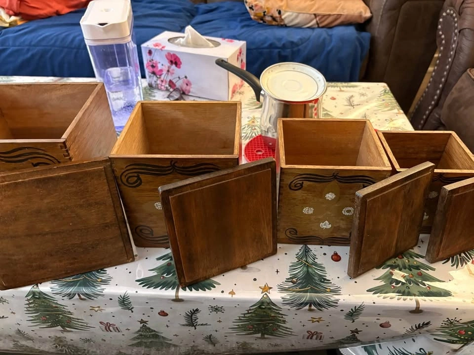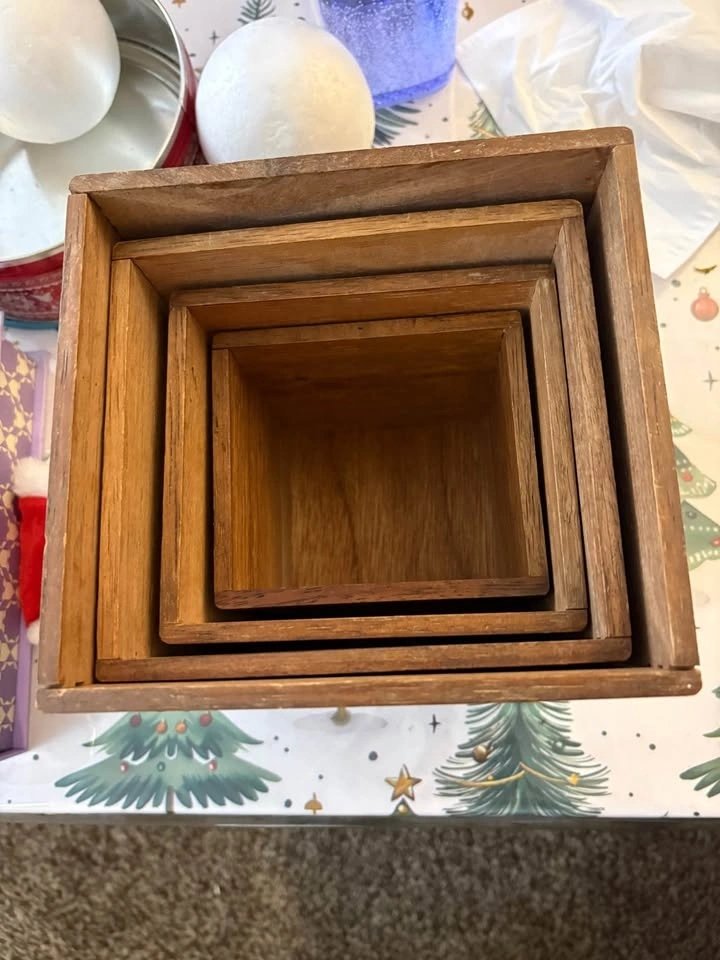 These wooden nesting boxes are in good condition and ready to add a touch of rustic charm to your home! They have some minor wear and tear, but are otherwise in great shape. The set includes four boxes of varying sizes, perfect for storage or decoration. Material: Wood. Quantity: 4 boxes. Style: Rustic.