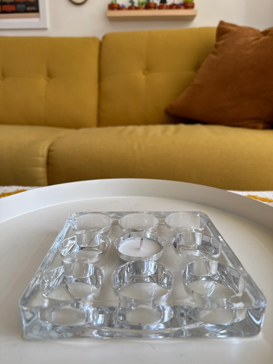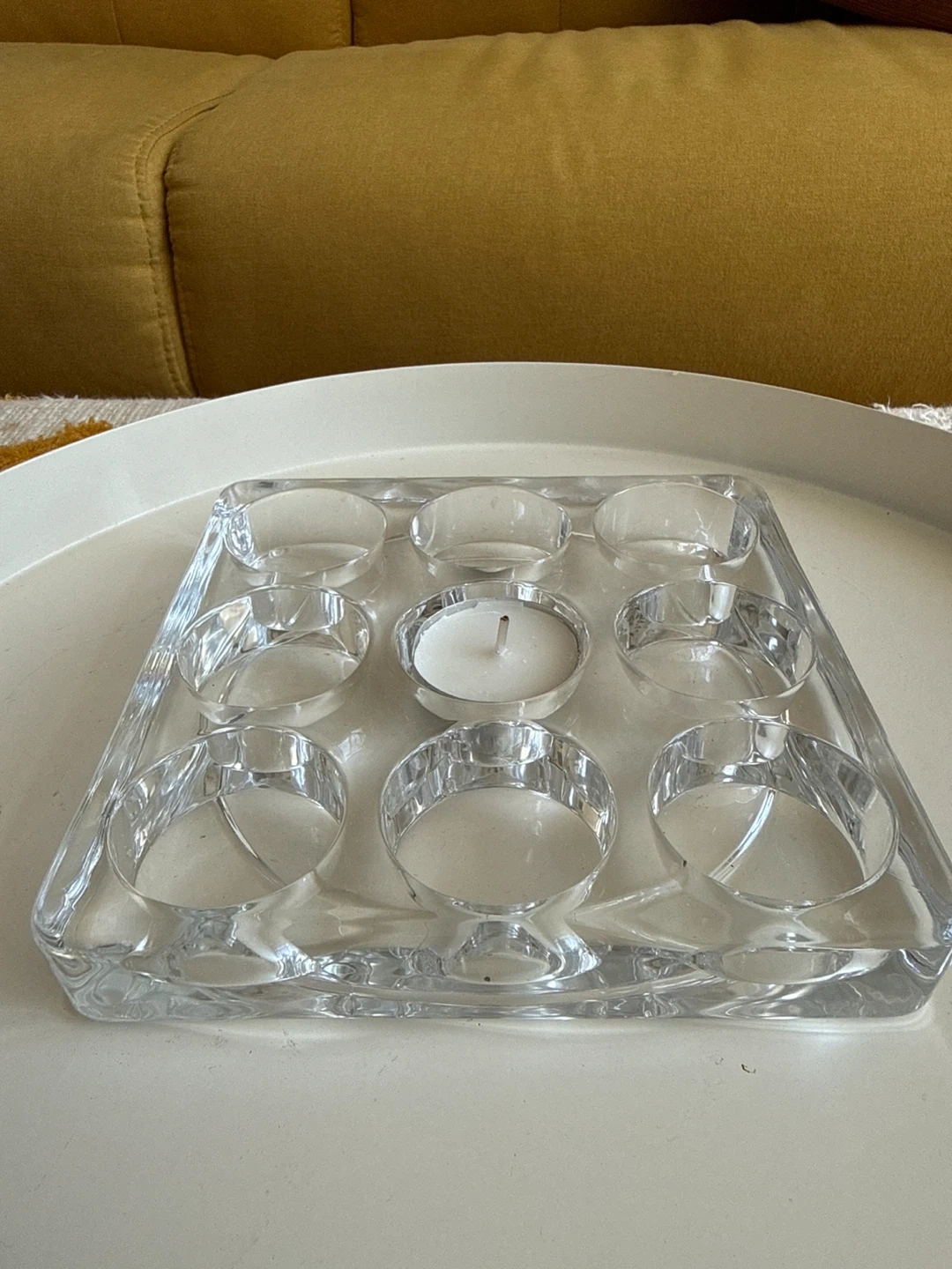 Glass candle holder with 9 individual spots for tealights. It's clear glass and measures approximately 6" x 6". This holder is perfect for creating ambient lighting.