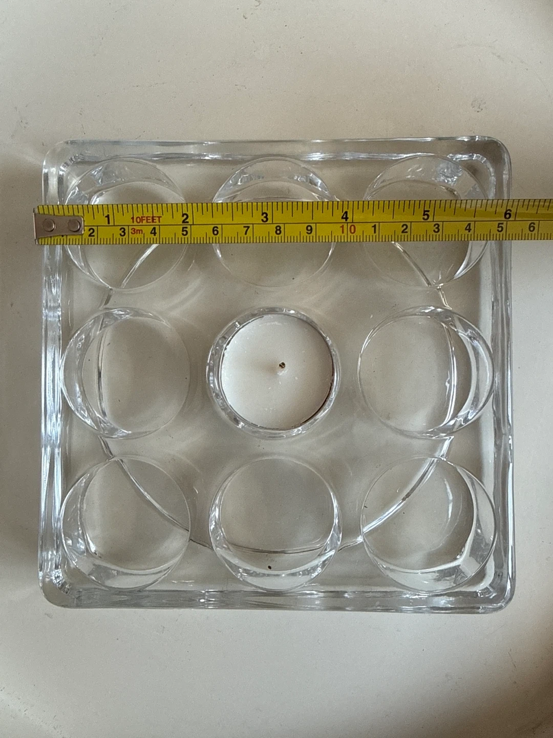 Glass candle holder with 9 individual spots for tealights. It's clear glass and measures approximately 6" x 6". This holder is perfect for creating ambient lighting.