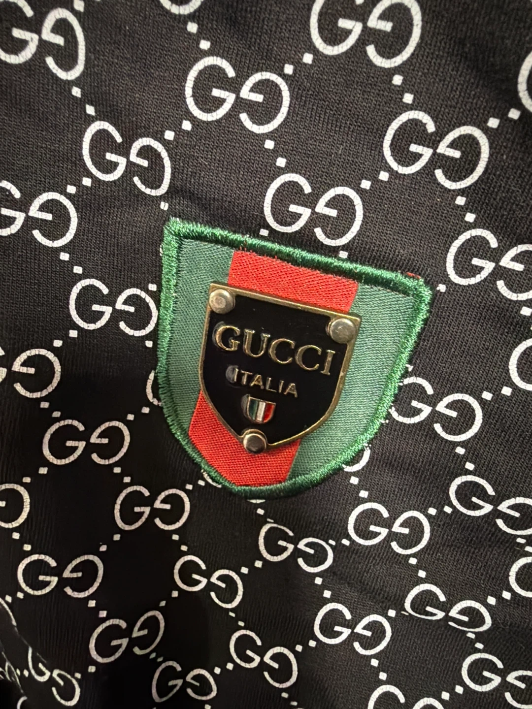 Black Gucci hoodie with signature GG monogram pattern all over. Features a full zip front and a green and red crest logo patch on the chest. Size medium.