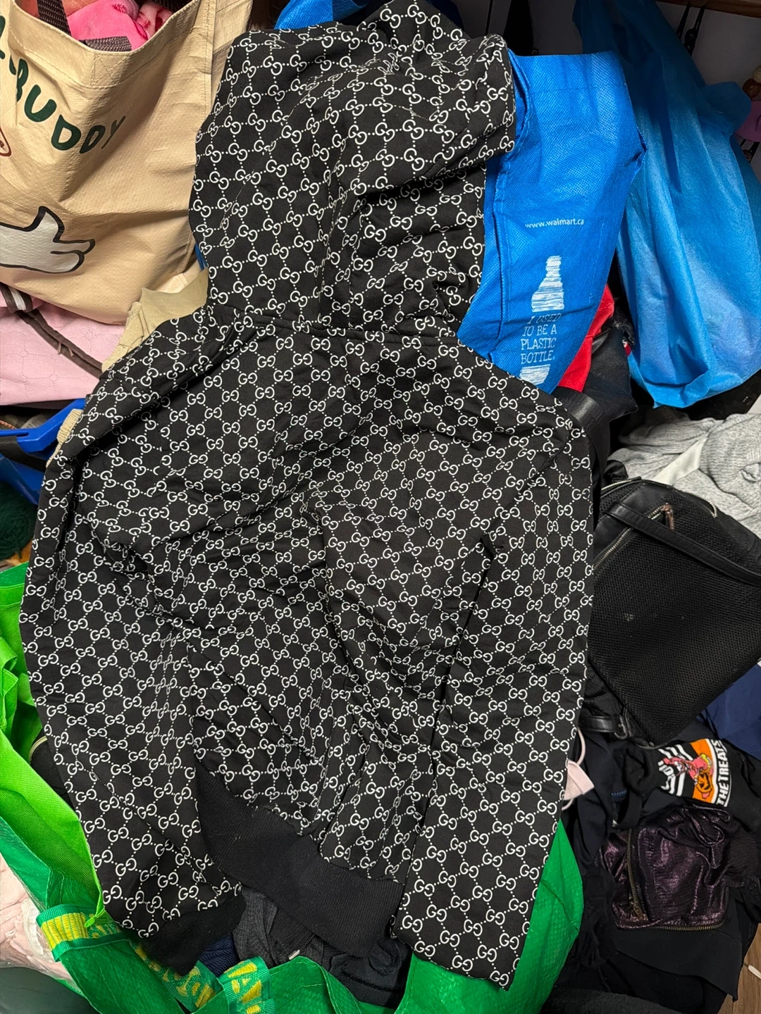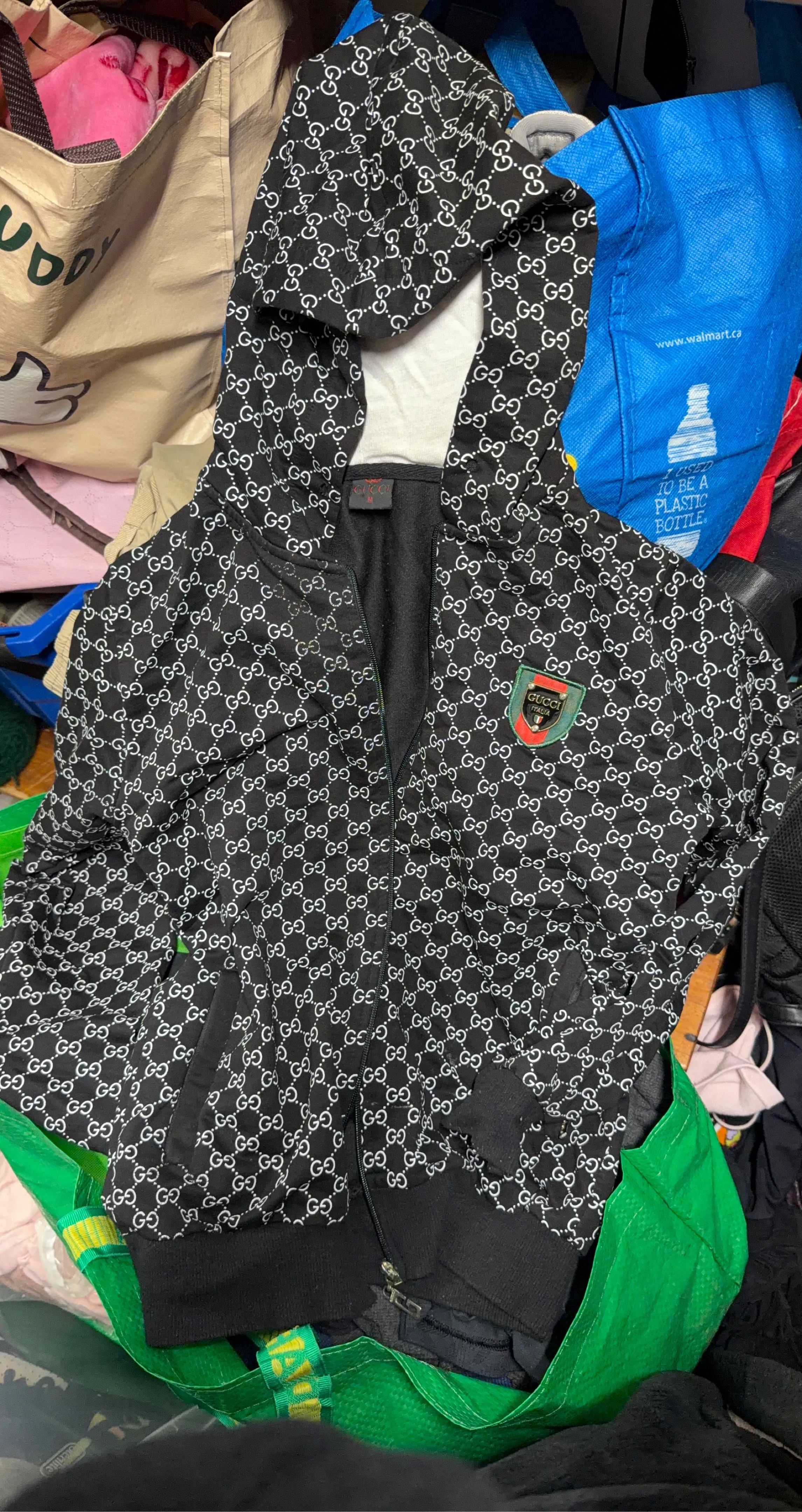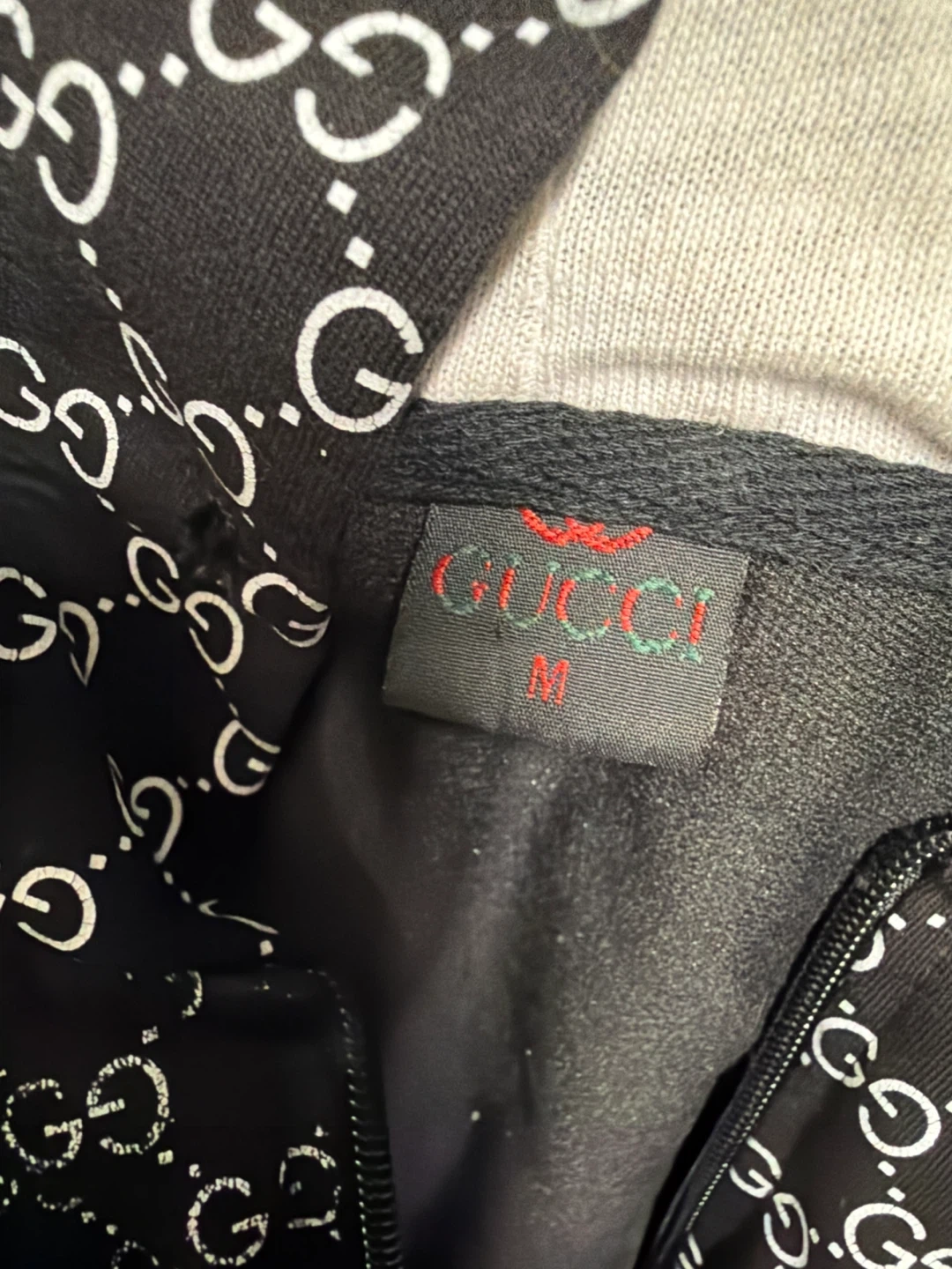 Black Gucci hoodie with signature GG monogram pattern all over. Features a full zip front and a green and red crest logo patch on the chest. Size medium.