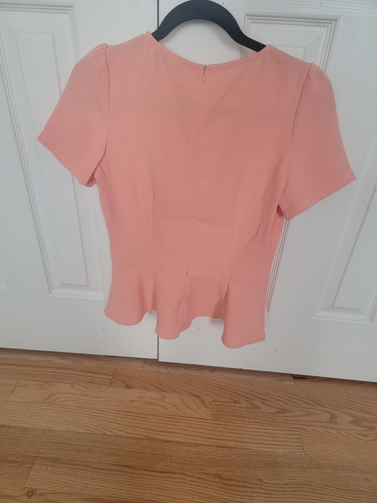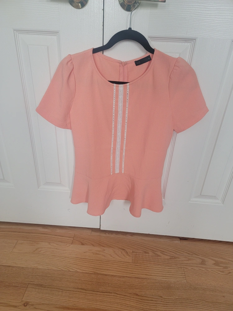 A beautiful peach-coloured blouse. Features a rounded neckline and short sleeves. Has a ruffle hem. A great top to wear on a relaxing afternoon. Has a white lace detail on the front.