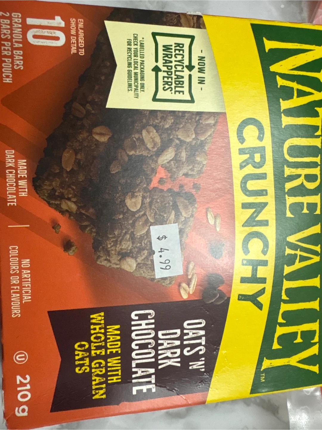 Nature Valley Oats 'n Dark Chocolate Crunchy Granola Bars. Made with whole grain oats and dark chocolate. Contains 10 granola bars per pouch, 2 bars per pouch. 210g total.