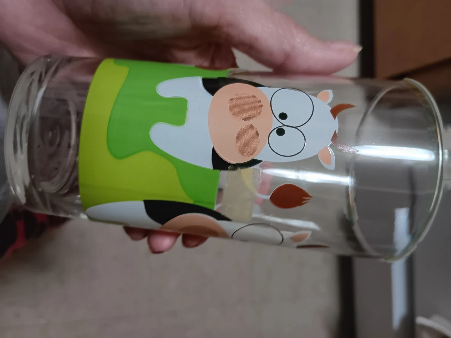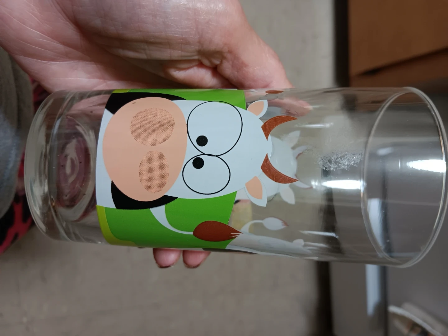 Fun cartoon cow graphic on a clear drinking glass. It's made of sturdy glass. This glass is great for kids or anyone who enjoys whimsical designs!