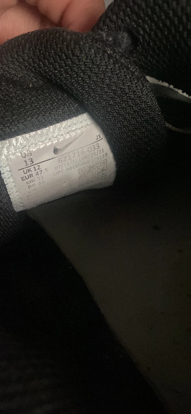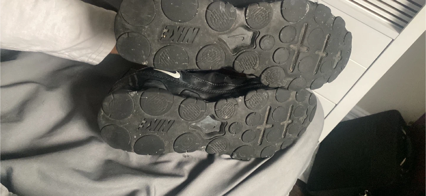 Black Nike running shoes in a men's US size 13. These shoes feature a durable outsole for traction. They're designed for athletic performance.