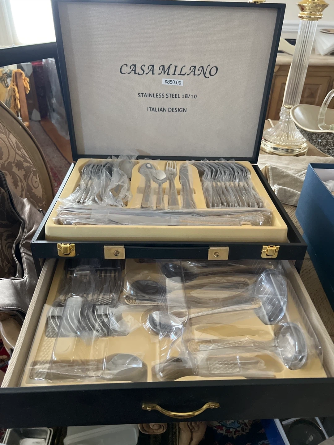 Casa Milano 18/10 stainless steel flatware set. Italian design includes dinner forks, knives, spoons, and serving utensils. Comes in a black storage case with drawers.