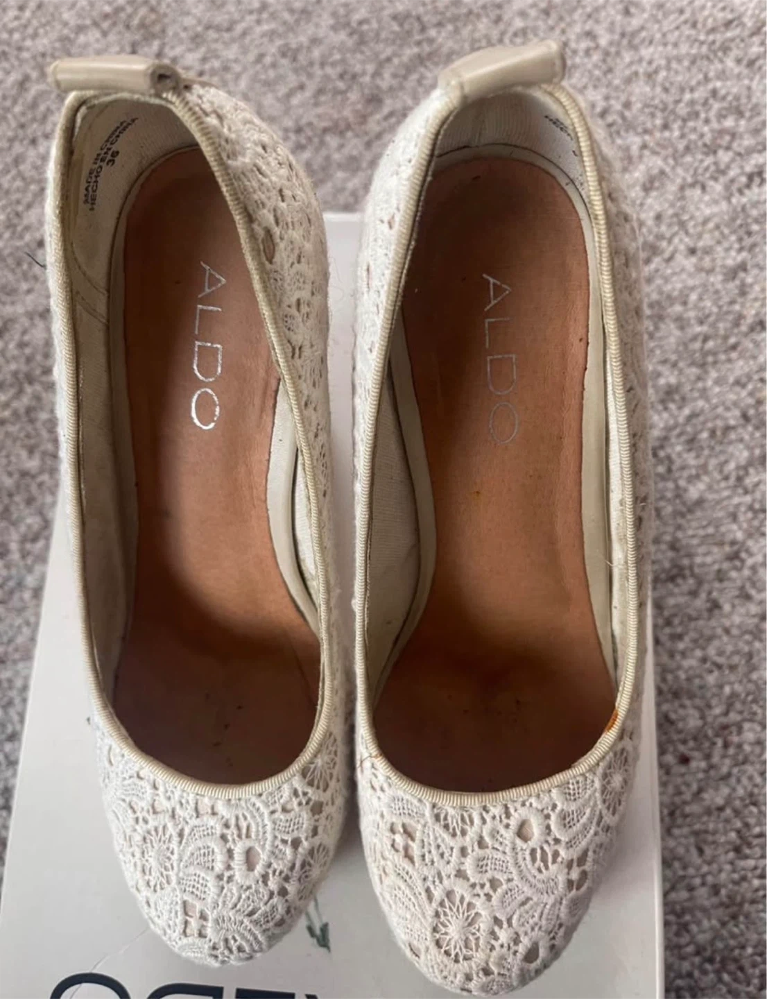 ALDO wedge heels with a delicate white lace overlay. They feature a comfortable espadrille wedge and a light beige trim. Perfect for spring and summer occasions!